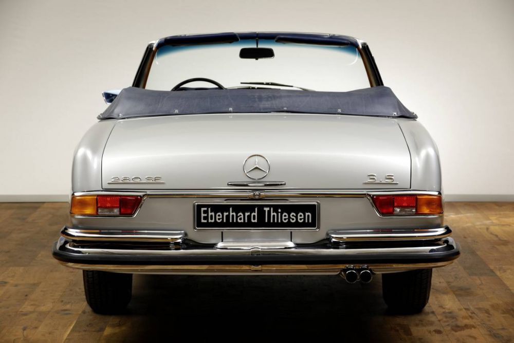 This Mercedes Benz 280 SE 3,5 Cabriolet was delivered and registered in the United States in July 1971. The Mercedes Benz delivery specification and equipment data card is available. The original color scheme in silver-metallic (at delivery according to the data card DB 180 silver-grey-metallic) with an interior in blue leather and a soft top in dark blue is classically elegant. The interior (DB code 245) is likely to be in original condition and very well preserved with a light patina. In 2013, the convertible was purchased in California (USA) in a restored and overhauled condition – evidenced by photos – and imported to Germany. Then the new owner had various further detailed body work carried out in Germany in 2016 for around 8,000 EUR (invoices available). Further work was invested in the car in 2021/2022 for visual and technical optimisation. In the course of the body overhaul, both rear wheel arches were extensively cut out and fitted with new metal plates. The rear center section has been completely replaced with an original Mercedes-Benz spare part. The front right sill had already been replaced in the USA. Otherwise the car was and is rust free. The engine is original matching numbers and has been completely overhauled here in Germany. The intake manifold pressure sensor and the computer for the D-Jetronic were overhauled at Bosch. In addition, the front and rear axles with all bearing rubbers, the engine mounts and the brake system with all brake calipers, the exhaust system, the original Behr air conditioning system and the power steering gearbox have been repaired or overhauled at specialist workshops. A complete overview of the work carried out and the corresponding invoices for more than 25,000 EUR are available. Also the technical inspection approvals (TÜV), a German historic registration (H) and the former US-title. This Mercedes Benz 280 SE 3.5 Cabriolet convinces with an excellent overall condition and perfect details. Its elegant color combination and design ensure a sophisticated appearance always and everywhere. The high level of comfort also allows for reliable classic car enjoyment for the whole family, even for longer trips and journeys. The elegant coupé and cabriolet of the W111 series was first introduced in 1961 as the 220 SEb Coupé. The simple yet impressive design penned by Friedrich Geiger and Paul Bracq marked a turning point in Mercedes styling away from the baroque opulence of the 1950s. There was a lot more handiwork in the small-series coupes and convertibles than in the W111 sedans. The series was continuously technically optimized. On the powertrain side, the 150-hp 2.5-liter engine of the 250 SE was introduced in 1965. Another new feature was the hydropneumatic compensating spring on the rear axle, which was fitted in place of the previous coil spring and kept the level of the body constant regardless of the load. In January 1968, it was succeeded by the 280 SE, which featured a newly developed 2.8-liter six-cylinder engine with 160 hp. In 1969, the 3.5-liter V8 engine with 200 hp made its debut as a completely new development. This was accompanied by a flatter engine hood and lower radiator grille, which led to the (unofficial) designation flat radiator as opposed to high radiator. In this way, Mercedes demonstrated what was technically feasible at the time and substantiated its claim to be the designer and manufacturer of the best automobile. Incidentally, this series was very popular with many celebrities and stars as a sophisticated coupé and cabriolet.