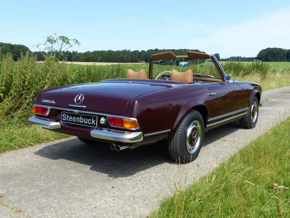 The Mercedes-Benz W 113 SL series, popularly known as the ‘Pagoda’ after the shape of the hardtop, has been around since 1963. From the 230 SL to the 250 SL, the optimisation was the 280 SL. Our Mercedes-Benz 280 SL Roadster, built in 1971, is one of the last examples built. Delivered to the USA, the classic car has been in Germany since 2004, where it has been thoroughly restored to a high standard. Since then, it has clocked up around 15,000 kilometres. Extensive invoices and receipts have been available since 2011. The special feature of this roadster is the six-speed gearbox, an ingenious combination in conjunction with the original American rear axle ratio. Here, driving becomes an experience, especially in today’s road traffic. The maroon paint colour in combination with the cream leather interior is very rare. With the attached hardtop, you suddenly have an extremely elegant coupé. EXTRAS: Six-speed gearbox, hardtop, car radio