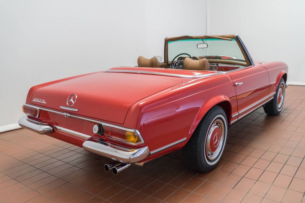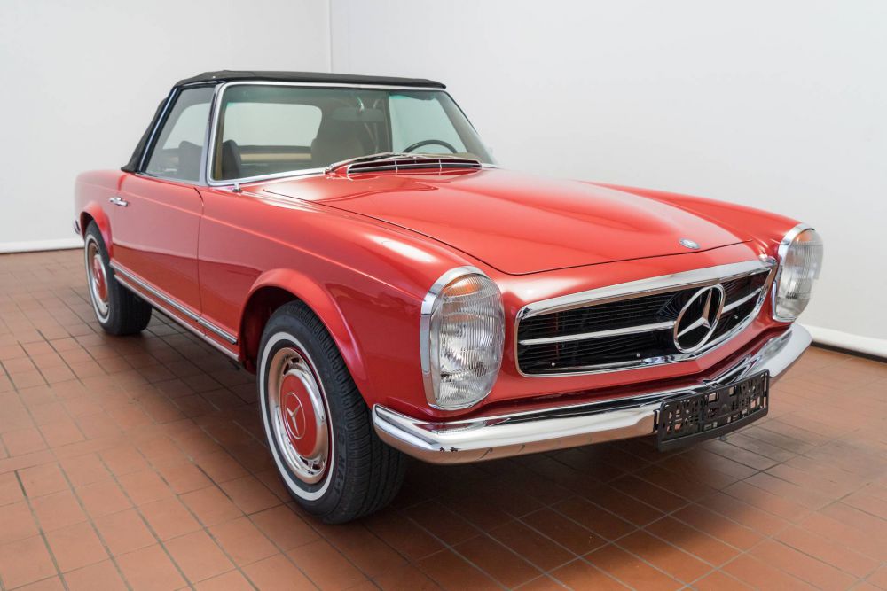 Mercedes-Benz 280 SL Pagode mit 6-Zylinder Reihenmotor und 4-Gang Schaltgetriebe, Lackierung: Wagen und Hardtop DB568 (signalrot), Polsterung: Leder Old Cognac 2-Ton, Wurzelnuss Holz, Einzelsitze, Servolenkung, Außenspiegel links, Radio Blaupunkt mit elektrische Automatik-Antenne. Komplettrestauration mit Classic Data Wertgutachten Note 1. Matching Numbers gemäß MB-Datenkarte. 12 Monate Garantie