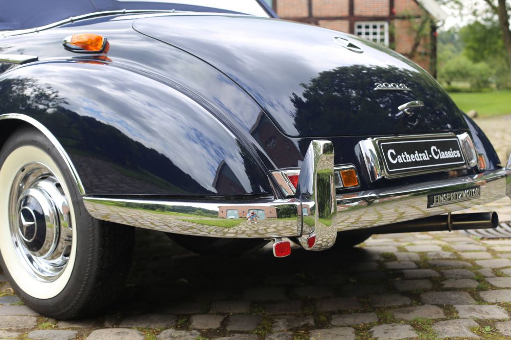 Ultra-rare floor gear shift (not column) Twin spare wheels Rear luggage cases Interior by Hecker and Lüder in Belgium Wood – Palisender Leather – Mercedes Natur Exterior paint 904 Mercedes period Dark Blue Completely overhauled engine, gearbox, and axles