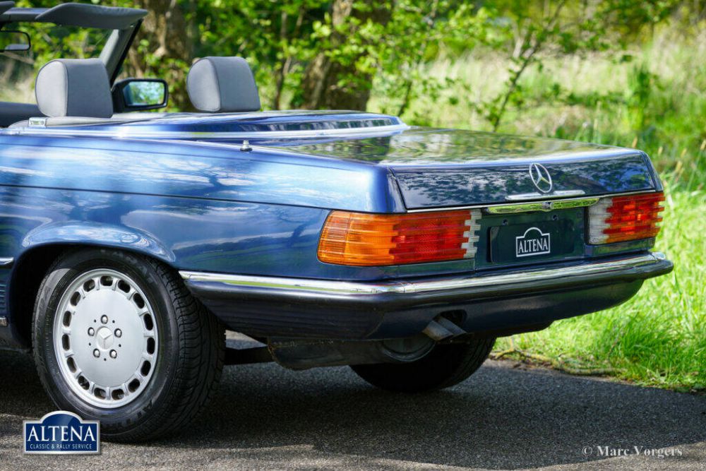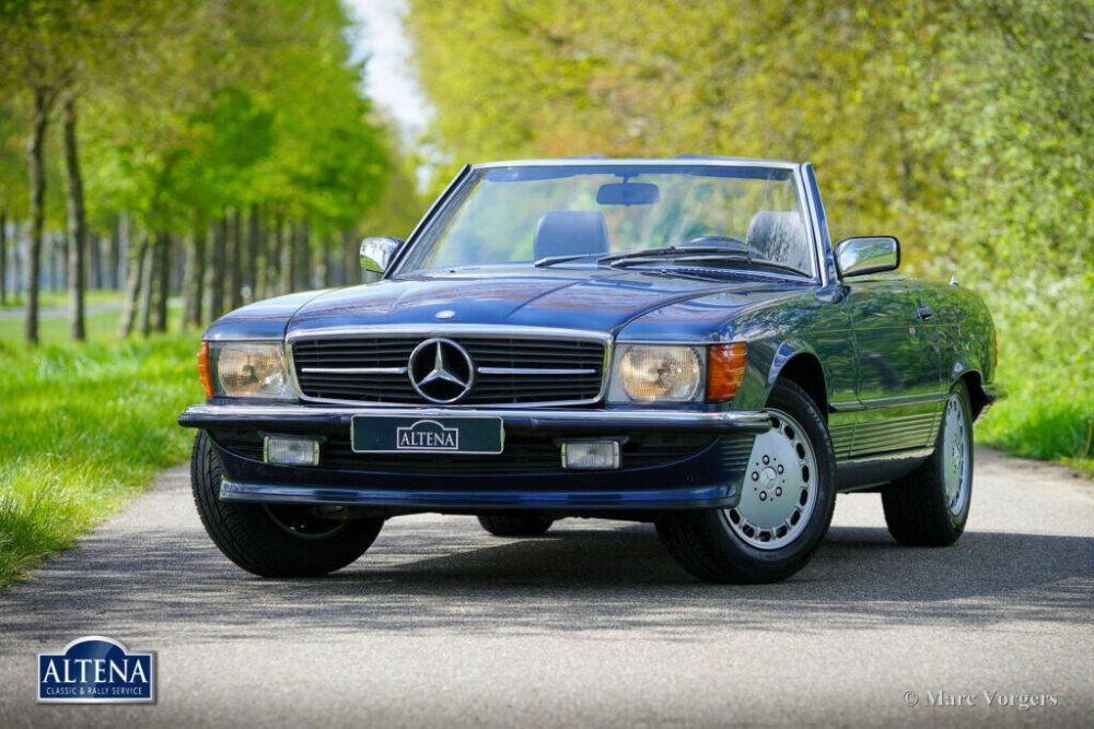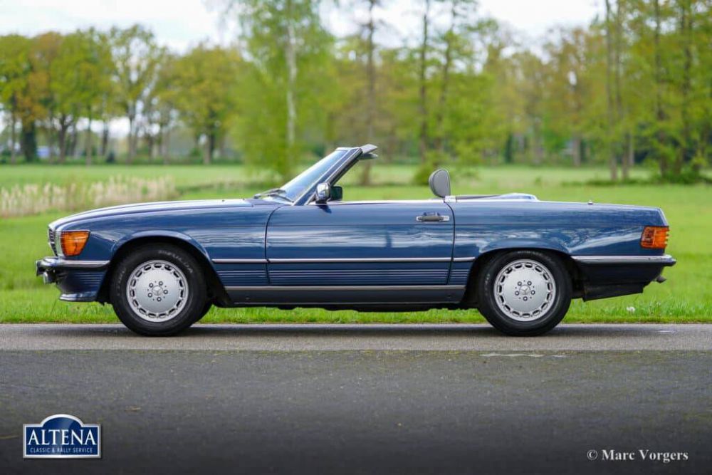 Mercedes Benz 300 SL (model R107 K6), year 1986. Chassis number WDB1070411A051476, engine number 10398212002707, gearbox number 72232202800040. Colour blue metallic combined with a grey leatherette ‘tex’ interior, grey carpet, and a dark blue hood. The car comes complete with the original hard top in body colour. The car is still completely to factory specifications with matching numbers and colours. The factory decals are still present. This 300 SL is a European model which was sold new to a Mr. Volckmann in Germany. A copy of the 1st owners old ID is present, as is the original set of booklets that came with the car, and the original delivery letter! The service book is filled out and stamped during the service intervals. In the year 2006 the Mercedes-Benz was imported to the Netherlands where the car was enjoyed and cherished by two consecutive owners. From new this 300 SL has driven 130.687 kilometres. The car is in a very good and super original condition! The bodywork is completely sound, the paint is wonderful and the chrome/ stainless steel parts are brilliant! The original interior is in a near pristine condition with only the slightest traces of previous use. The six cylinder in-line engine runs smooth and powerful, the automatic 4-speed gearbox shifts perfectly, and the car steers and brakes superbly. The car is fitted with a steering wheel with leather rim, the original Becker Mexico radio (including original operating instructions), the original MB alloy wheels shod with very good Fulda Carat tyres around, and it comes with a never used original spare wheel and the original tool set. This is a fantastic Mercedes-Benz 300 SL in magnificent factory original condition!