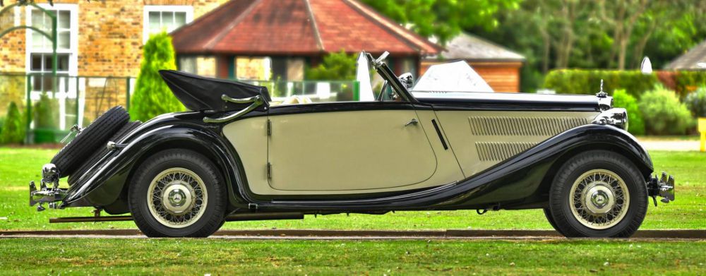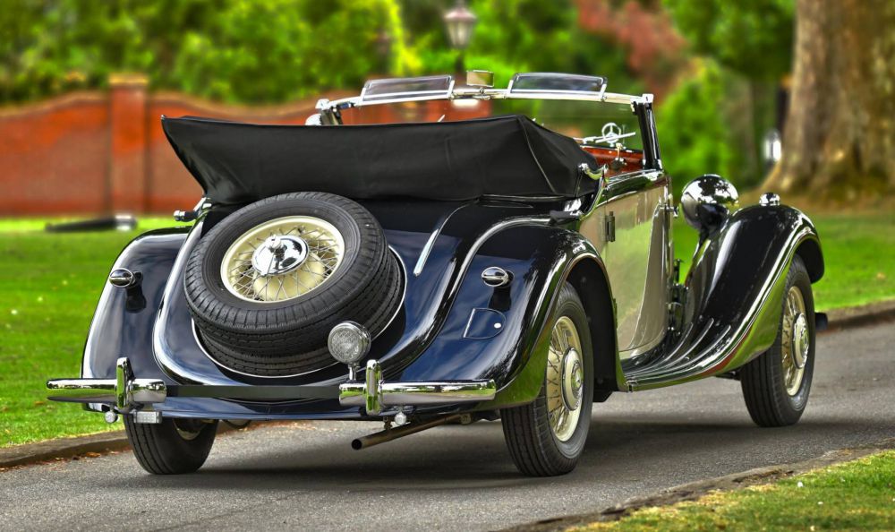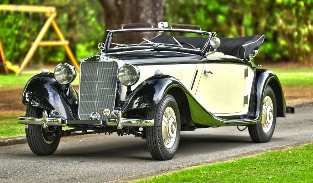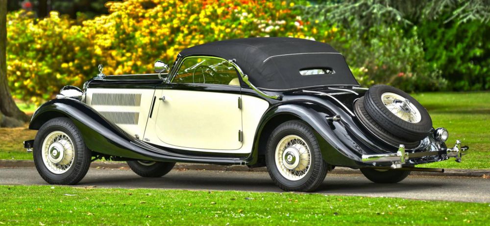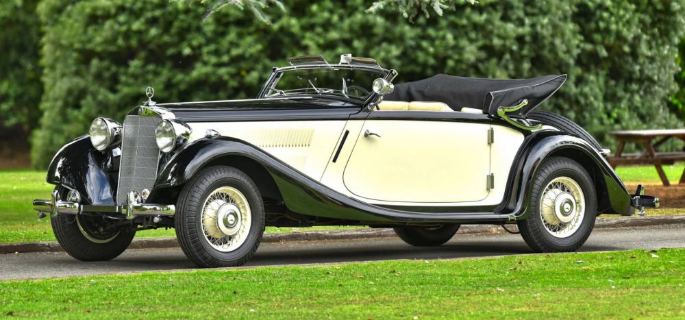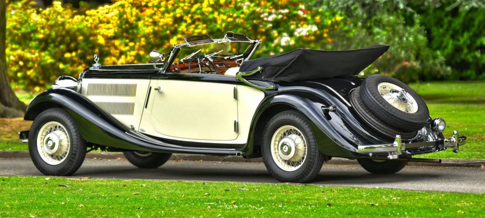 1939 Mercedes 320 Cabriolet A. Chassis Number: 435308 Registration number: TBA One of 885 such examples produced. This car has been the recipient of an exhaustive nut & bolt restoration finished early on this year. The car was discovered in dilapidated condition some 30 years ago in the Czech republic at which time it was purchased with a view to restoration by the curent owner. The car is flawless & of concours show winning quality. It is simply stunning to drive & is a show stopper on the street. Specification is as follows: 77 bhp, 3,405 cc overhead-valve inline six-cylinder engine, four-speed manual transmission with overdrive, central transverse leaf-spring front suspension with coil springs, swing axle rear suspension, and four-wheel drum brakes. Wheelbase: 2,880 mm Mercedes-Benz’s 320 of the late 1930s occupied the same position in the company’s hierarchy that the E-Class does today: it was a competent performance car without the sheer brawn and Teutonic force of the big eight-cylinder models, but it was still swift, luxuriously bodied, and elegantly appointed. The 320 showed that one had arrived in the world, but also that one was still careful about one’s money. Typical of Mercedes-Benz in this era, a wide variety of beautifully crafted body styles were made available, to suit virtually every taste and desire. This Mercedes Cabriolet A is badged as having been produced at the Daimler-Benz factory in Mannheim, and it shows just 1002 kilometres since restoration. It is the ultimate W142 version, with the bigger 3.4-litre engine and the desirable overdrive. It is appointed in a beautiful, rich black and primrose yellow, with a complementary black canvas top that is headlined in beige cloth and cream leather upholstery. Trim is correct throughout, including Bosch headlamps, milk glass parking lights, a driver’s side spotlight, period traffic signals, triple wiper blades, and chrome wire wheels. Peering within the car, one sees such fine details as a single jump seat behind the driver’s seat, which is suitable to hold one’s child or a third very uncomfortable adult. Lowering the shelf behind the jump seat allows for stowage of suitcases, ideal for the grand tour. Interestingly, the driver has his or her own bucket seat, with a wider seat supplied alongside for the passenger. The interior is trimmed in finely figured burr walnut woodwork, which surrounds very nicely restored gauges.