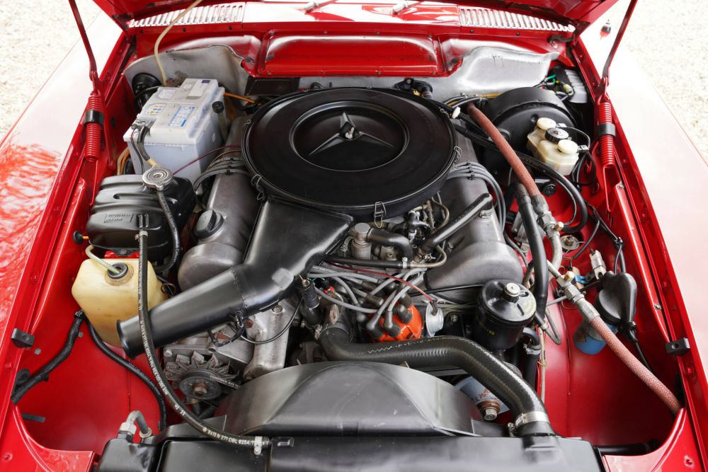 Under the bonnet, we find the eight-cylinder-engine. This is a great engine and a good combination with the automatic gearbox. Mercedes really did a good job with the suspension at the time, and this car takes you back to 1972. Stable handling and simply a nice driving car.