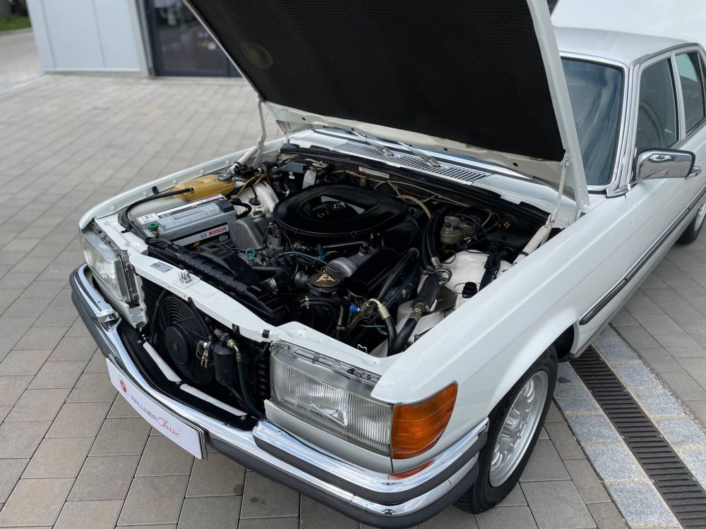 Dieser Mercedes-Benz 450 SE (W116) in Classicweiß mit blauem Stoffinterieur wurde am 01.07.1979 erstzugelassen. Es handelt sich um eine japanische Erstauslieferung – ein japanisches Serviceheft, die Betriebsanleitung und verschiedene weitere Dokumente sind vorhanden. Der Klassiker befindet sich seit 2018 im Besitz des derzeitigen Eigentümers und ist technisch sowie optisch in einem wunderschönen, guten Zustand, was durch ein Wertgutachten aus dem Jahr 2019 mit der Note 2 dokumentiert ist. Ebenfalls vorhanden sind zahlreiche Rechnungen der Instandsetzungsarbeiten, diverse TÜV-Dokumente sowie ein deutsches Serviceheft. Außerdem ist der Mercedes-Benz 450 SE (W 116) mit folgendem ausgestattet: Radio Becker, Außenspiegel rechts, Fensterheber elektrisch 4-fach, wärmedämmendes Glas rundum, Tempomat, Armlehne vorne klappbar, Kopfstützen im Fond 2-fach, Zentralverriegelung.