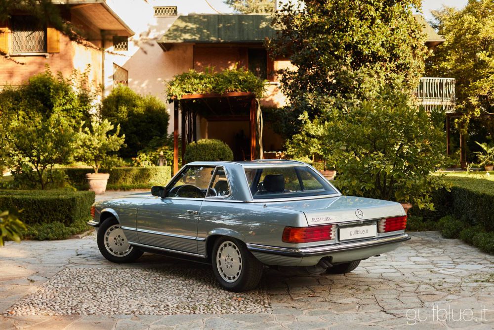 Bellissimo esemplare di Mercedes 500 SL (R107), venduta a Rimini nel 1983 nel colore diamond blue metallic con interni in pelle blue, con cambio automatico.
