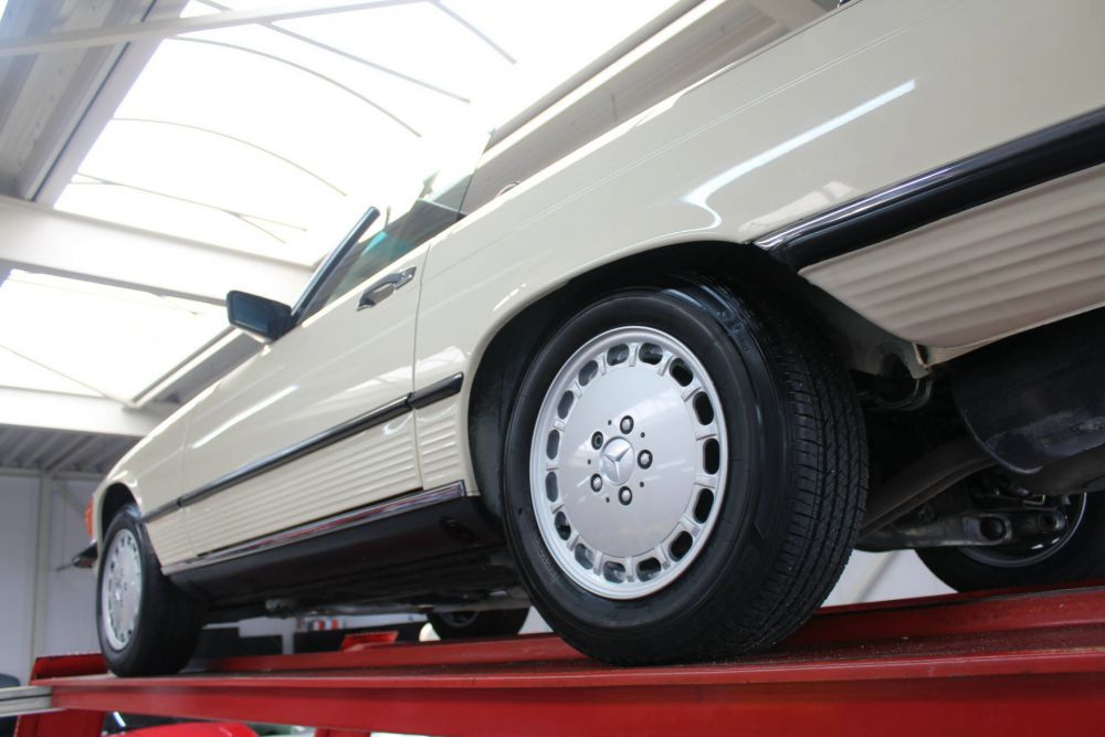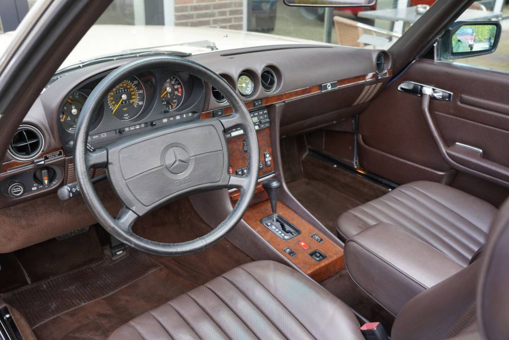 This magnificent 560 SL exudes elegance in its Light Ivory, combined with a beautiful dark brown leather interior. The powerful 5.6-litre V8 engine, specially designed for the American market, delivers no less than 227 hp and 287 Nm of torque at 3,500 revolutions per minute. As we said, this car is not only a feast for the eyes but also a powerful driving machine.