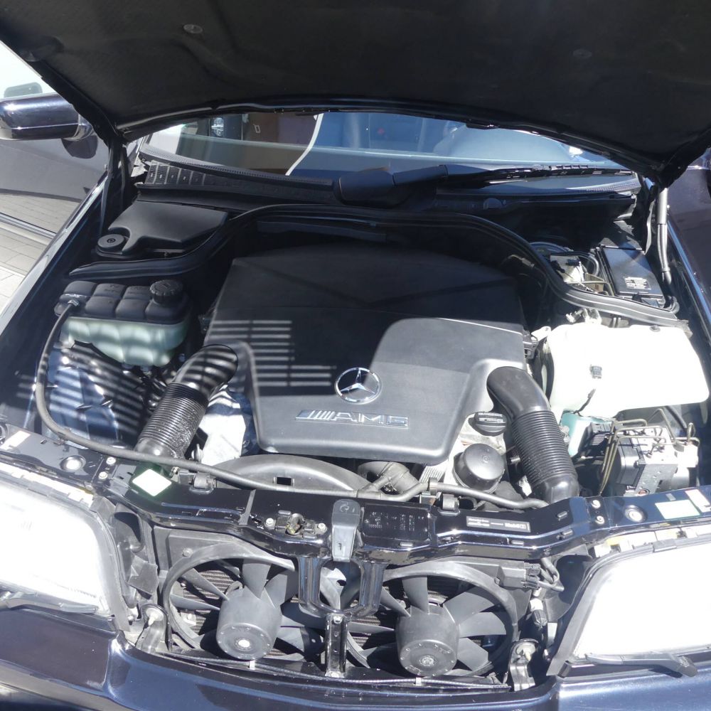 Über den Zustand eines Concourspreisträger muss man nicht viele Worte verlieren, die Tatsache spricht für sich. Erwähnenswert ist vielleicht die Tatsache, dass es sich um einen der wenigen C43 AMG handelt, die mit klassischem Stahlschiebedach ausgeliefert wurde. Der C43 ist in Designo Brilliantschwarz (025U) lackiert, das in der Sonne dunkelblau schimmert und hervorragend mit der schwarz-blauen Innenausstattung harmoniert. In den letzten Jahren wurde das Fahrzeug nur in den Sommermonaten zu Klassikveranstaltungen bewegt. Die Laufleistung beträgt 107.043 Kilometer. Ausgeliefert wurde das Fahrzeug im März 1998 durch die Mercedes-Benz Niederlassung Berlin und es verblieb immer, im Gegensatz zu vielen anderen C43 AMG mit geringer Laufleistung, in Deutschland.