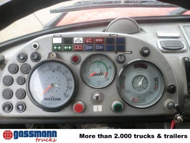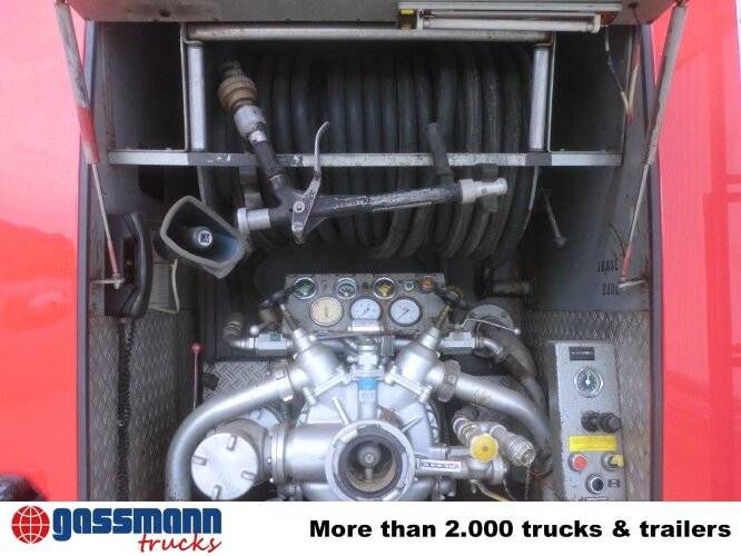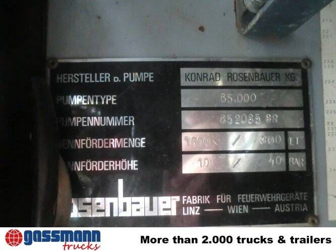 Pumpe Konrad Rosenbauer Typ: 65000 Nennfördermenge 1600/300 ltr., Nennförderhöhe 10/40 Bar, 3.800 ltr. Wasserbehälter und 220 ltr. Schaumbehälter, Servolenkung, Verteilergetrieb untersetzbar, 6-Zylinder, OM 355 Motor, ZF-Getriebe, unsynchronisiertes Getriebe (Zwischengas), kann auf Wunsch auf Singlebereifung umbereift werden.