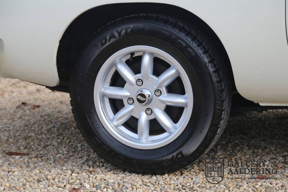 The bodywork has been taken care of with beautiful thin and original sheet metal. During the restoration, the sheet metal was repaired where necessary. The car was repainted during the restoration in the very beautiful color: Old English White. Many new parts were used during the construction of the car. The interior was completely reupholstered, the moldings and bumpers were all replaced with new ones and the car received new 15-inch Minilite rims.