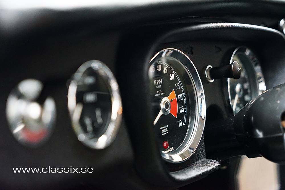 Interior: Perhaps the best thing with this MGB GT is the truly amazing original interior. The original leather is still in great condition. The carpets are nice and clean. The dashboard and the all working instruments are just beautiful. There is even a working time period correct radio. If you should ever get tired of the wonderful raspy exhaust note. This was during the time period when it became law having a steering lock in Sweden. So this MGB GT just like all others sold in Sweden has the ignition down on the steering column.