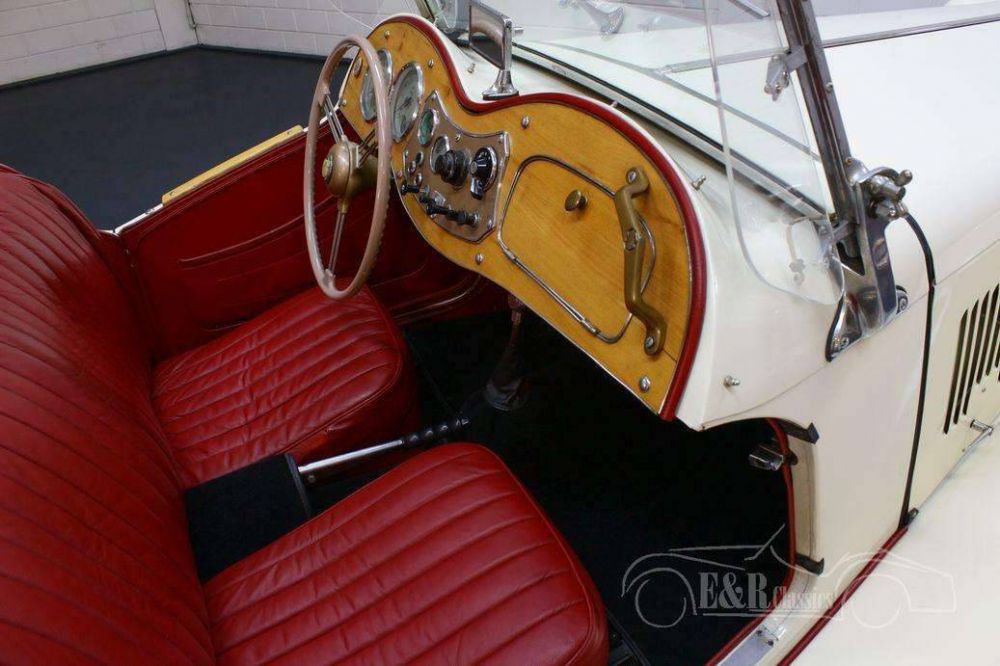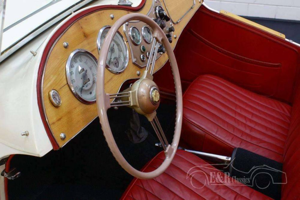 As you can see in the photos, this MG TD is really a sight to see. It has a beautiful cream-coloured paint that combines very nicely with the red interior and all chrome accessories. The British Classic is also equipped with a number of nice extras such as a red grille, chrome luggage rack, black soft top and wooden dashboard.
