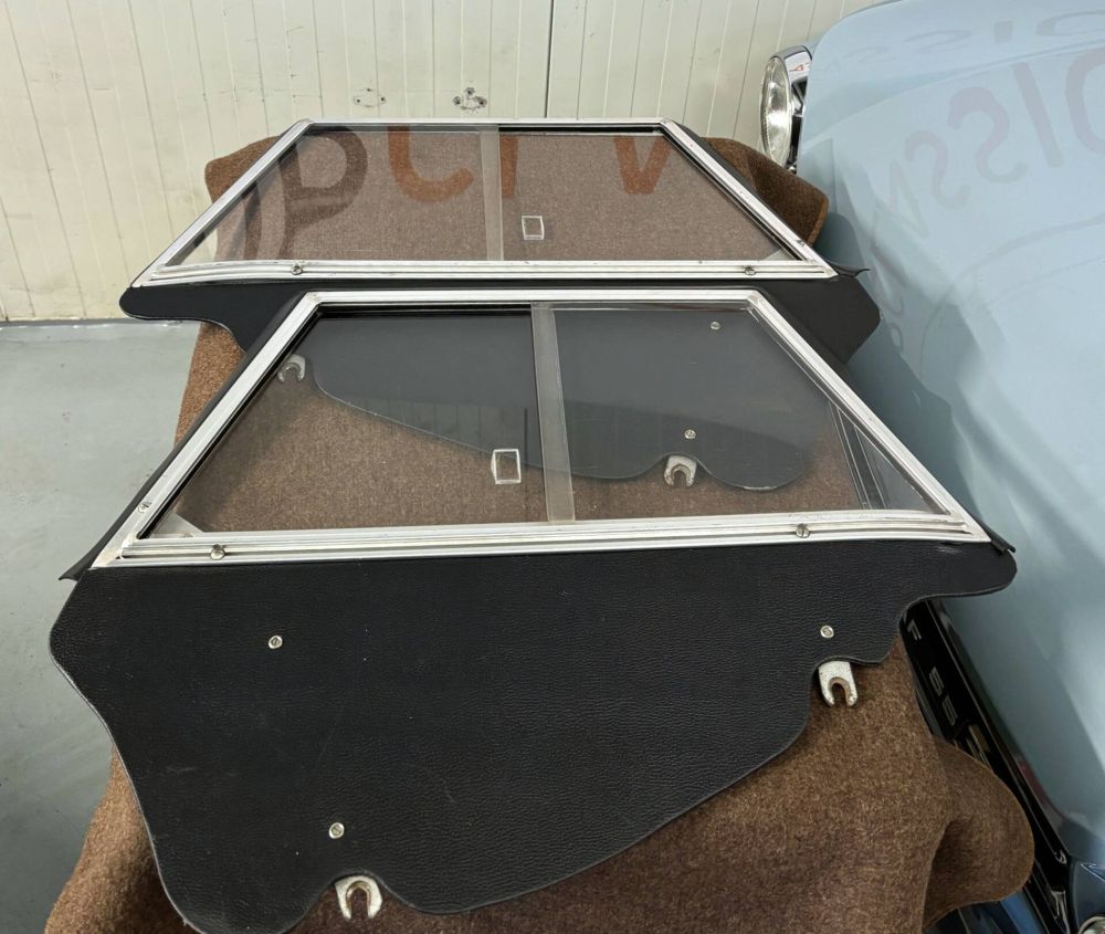 The interior is also in very good condition. The seats have been reupholstered and covered in new black leather. They sit very well and look very nice. The left seat shows some signs of use. You sit comfortably behind the Moto Lita wooden steering wheel, with the small gear lever within easy reach. The view across the long bonnet, with all the cooling slots and headlights, is superb anyway, and as far as driving is concerned, the unfiltered sound of the rebuilt V8 is a thrill and you feel everything because you are open and exposed inside the car.