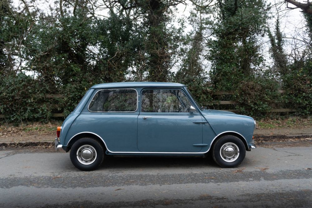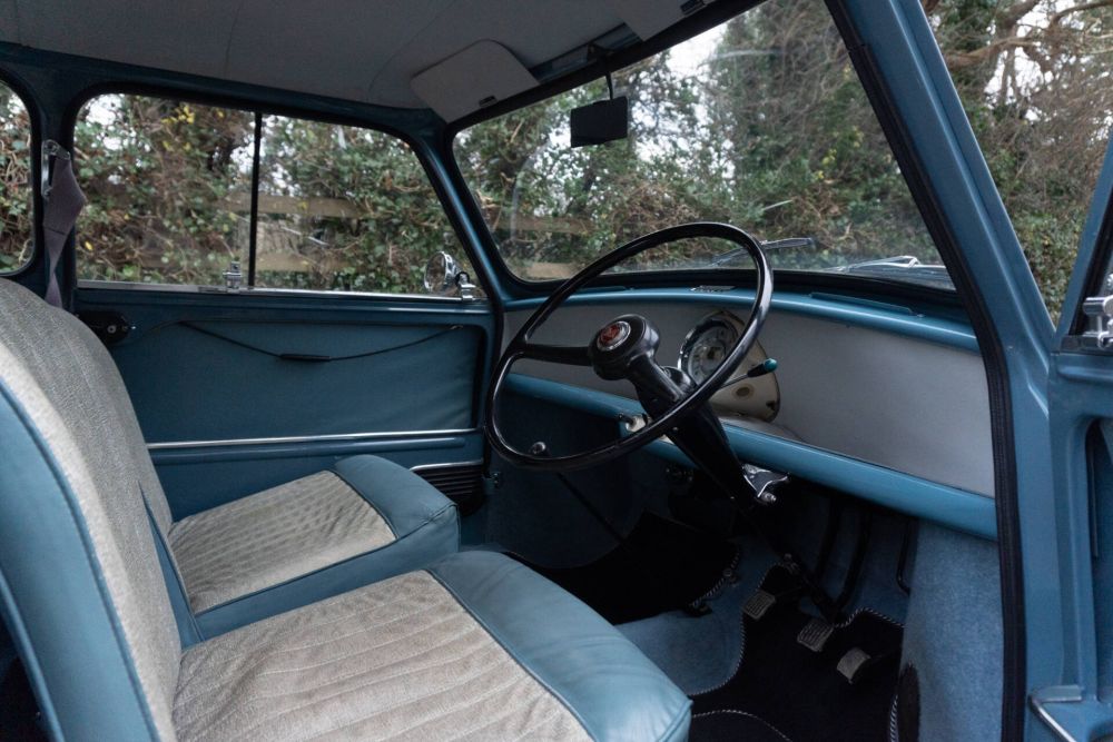 This is an incredibly special Morris Mini Minor De-Luxe Saloon that was manufactured on the 4th July 1960, leaving the factory three days later finished in Clipper Blue with Grey Fleck and Blue trim. This very correct car was then sold new by Wadhams Holdings Ltd in Waterlooville, Hampshire to the daughter of a local vicar who owned the Mini for four years. The Southsea branch of Wadhams Ltd then sold the Mini to its second owner, a Miss Charman in Portsmouth on the 2nd May 1964, the bill of sale is still with the car along with some other Wadhams Ltd correspondence. When Miss Charman married, the Mini was transferred into her husbands name and the car then used as daily transport until the early 1970’s when it became the second car. By December 1984 age had taken its toll and its long term owners decided to have the Mini stripped to the bare shell ahead of a total, complete rebuild. Over an eight year, five month period, a staggering 1800 hours was spent rebuilding the car, retaining as much originality as possible. Two large lever arch folders detail an amazingly detailed restoration diary and logbook, pages and pages of reading to substantiate what was a true labour of love restoration. A third folder of history contains invoices, maintenance, tax discs, MOT's and the early paperwork. The body was completely rebuilt with new panels to include new inner and outer A panels, wings and front panel, door hinge mounting panels were replaced, the subframe kept in place to act as a jig to ensure everything lined up correctly. New inner and outer sills were fitted, the boot floor and boot hinge panel replaced and on completion of a major body restoration, the shell re-painted in the correct, original Clipper Blue.