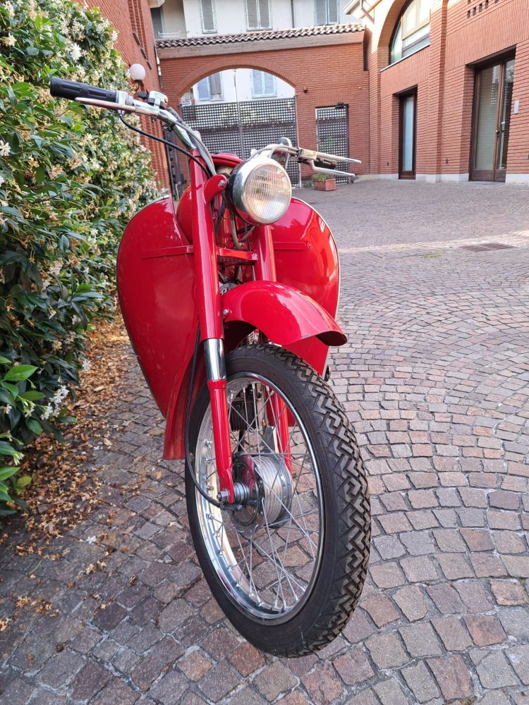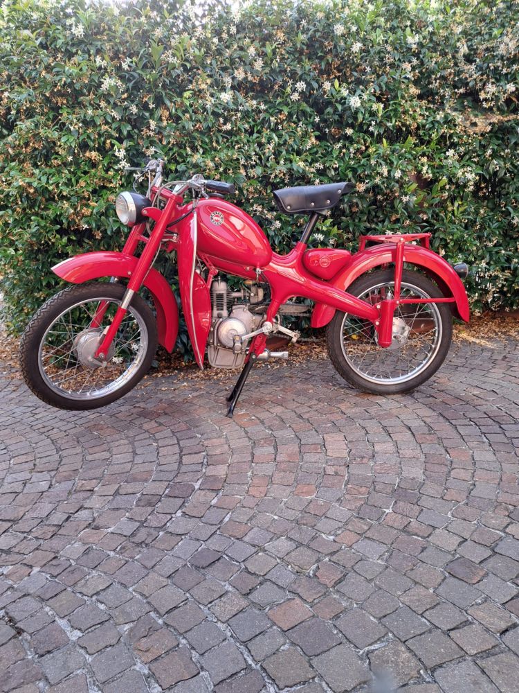 Qui abbiamo in vendita un esemplare di Motom 48 Turismo, completamente restaurato e funzionante. Verniciatura rosso Motom in condizioni eccellenti, sella monoposto nera, portapacchi posteriore e dettagli cromati perfettamente conservati.