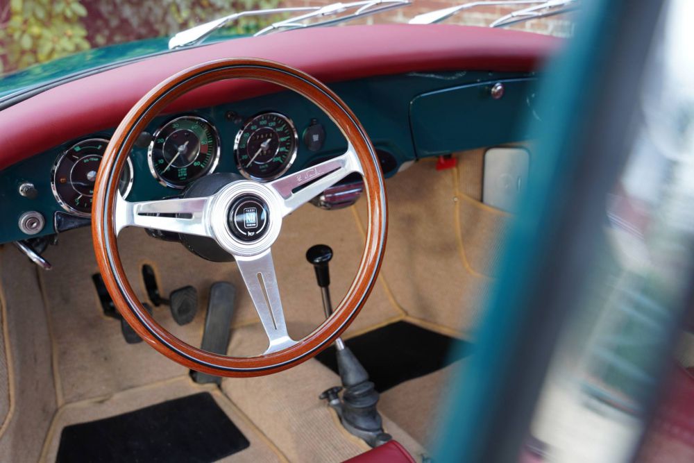 Looking further inside, the eye is drawn to a beautifully restored interior. The leather Speedster bucket seats in red-brown leather, the matching lacquered dashboard with the brilliant black dials with mint green print: the interior of the 356 is truly very special. The beige carpets and the very beautiful Nardi steering wheel complete the party.