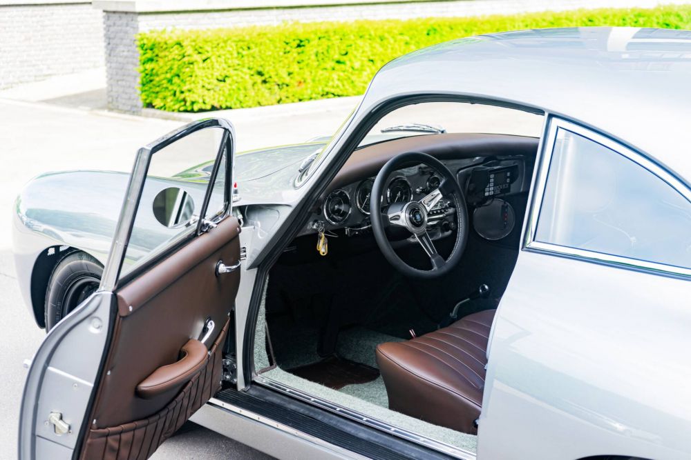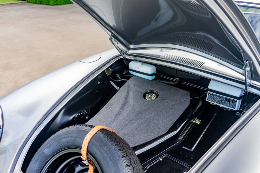 The exterior was based on the Porsche shade called GT Silver. The silver metallic was matched with a dark deep brown and grey-green German Square weave carpets for the interior. In keeping with the performance theme, a roll cage was installed and painted body color, the Nardi steering wheel, Belmog timekeeper, and a clock finish the interior. Door panels and seats are correctly contoured and upholstered contrasting against the German square weave carpet. The rear received a beautiful bench-like cover and the headliner is color matched as well.