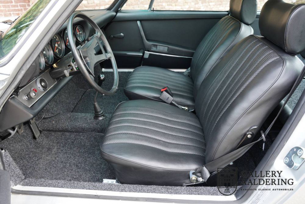 The 911 you see here is a pristine 2.4 E from 1972. Connoisseurs will already know: it concerns the so-called 'ölklappe,' the variant with the external oil filler cap behind the passenger door. This cap disappeared as suddenly as it appeared because it was often confused with the fuel filler cap. Therefore, the 'ölklappe' was only produced in 1972.