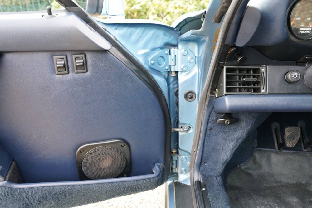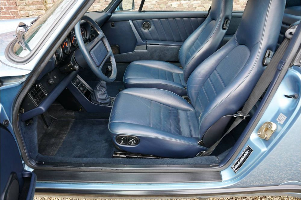 The bodywork is in very good condition, with perfect fitment. The paintwork is mostly original and in beautiful condition. All correct stickers are in the right place, including the one under the front hood. This 911 is finished in the original color 'Iris Blue Metallic' with a dark blue leather interior. The interior, along with the carpets and steering wheel, is in very original condition. The seats show minimal signs of use, as does the dashboard, and are still very neat.