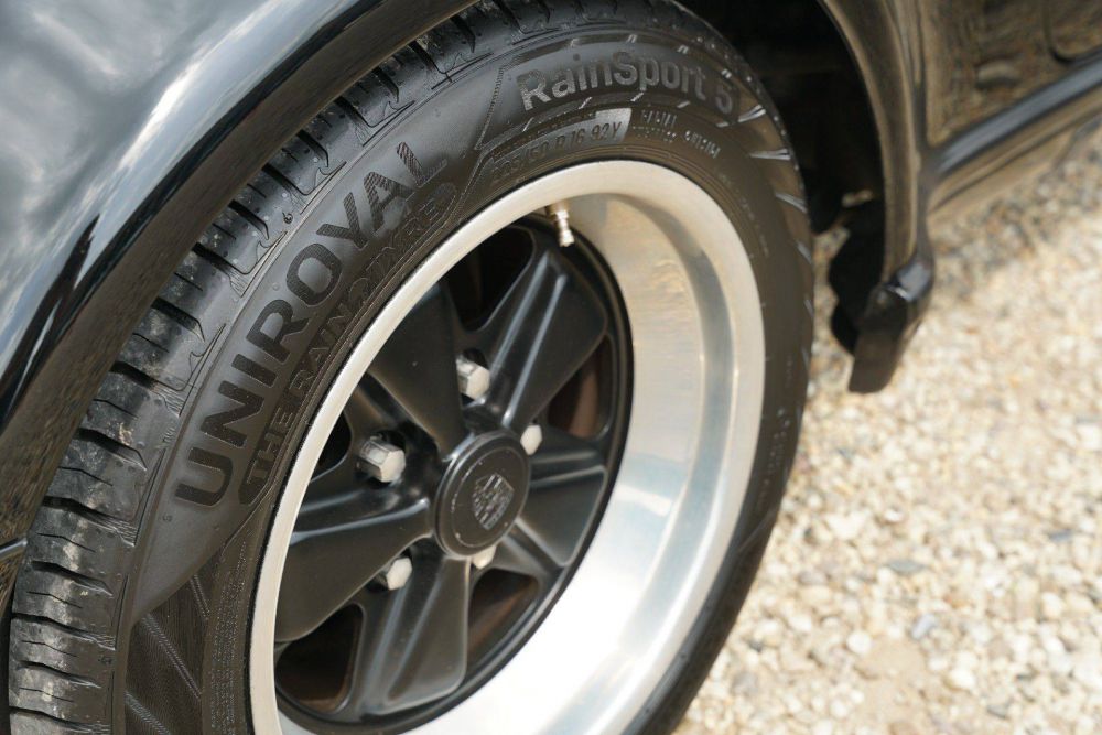 The bodywork looks great. Its correctly aligned panelwork is nice and thin. The cosmetically resprayed black paintwork is in very good condition. The Fuchs rims look great and the rear spoiler rubber is in very good condition.