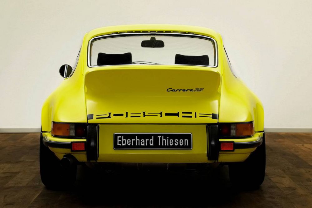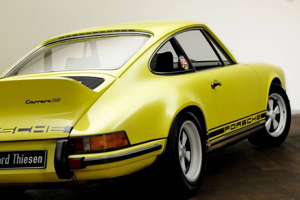 The Porsche 911 2.7 Carrera RS was launched in 1972 for homologation in rallying and racing and became a sophisticated bestseller. Instead of the required 500 units, 1,580 vehicles were finally produced, of which 1,308 were the comfort-optimised Touring version. Today, the 911 Carrera RS is one of Porsche's ultimate legends and rare classic models. This 911 Carrera RS Touring (code M472) was delivered via the Schmidt-Koch dealership in Bremen and first registered on 11. December 1972 to a company in Bremen (name known). Based on the chassis number, it is the 104th vehicle built and thus belongs to the first 500 examples manufactured for homologation. The original colour scheme was and is light yellow (colour code 117-8-1) with interior in black. The Recaro sports seats are finished in a fabric/leatherette combination. The paintwork was renewed in the course of the partial overhaul of the body (including door sills) in the mid-1990s. In April 1980, it was sold to the second owner in Hamburg. As early as May 1981, the car was passed to the third owners, a married couple in the north of Hamburg. The old original vehicle registration document on these owners is available. The couple kept the Carrera RS for a full 33 years and used the car regularly. Numerous invoices for service, repair and overhaul work are available from this time. Some of this partially more extensive work was carried out by the well-known Porsche 911 specialist Ingo Stimming in Schleswig-Holstein. Since 2014, the Carrera RS has been with its fourth and current owner in Hamburg. The engine was rebuilt respectively revised in 2015 at a well-known engine specialist according to Carrera RS specifications with corresponding performance. A related invoice and performance measurement are available. In the course of this, a new clutch was installed and the existing 915 gearbox was revised. The bearings, oil pump and main bearings of the crankshaft were also renewed and the throttle valves of the injection system were replaced. The Porsche 911 was introduced in 1964 as the successor to the 356. It was then built for almost 10 years as the first generation – the so-called F-Model or Urmodell – with numerous modifications in various versions until it was replaced by the modified G-Model in 1973. In October 1972, the today legendary Carrera RS 2.7 was presented at the Paris Motor Show. RS stands for “Rennsport” (racing) and this model was actually only intended for homologation in rally and motorsport with a required number of 500 units. Weight, engine, chassis and aerodynamics are intensively optimised for motorsport use. By the end of November, all 500 vehicles had been sold and Porsche decided to continue production. The air-cooled six-cylinder boxer engine with a displacement of 2.7 litres (engine type 911/83) had a mechanical double-row injection pump and produced 210 hp. It was the first 911 to be given the Carrera designation again, which had previously marked the most powerful 356 models. With a top speed of 245 km/h, the Carrera RS was the fastest German series car of its time and also the first road sports car in the world with a front and rear spoiler. The distinctive rear wing, nicknamed the duck-tail, significantly improved driving stability. The special front spoiler had an opening in the middle for an oil cooler. Differently wide wheels on the front and rear axles ensured higher cornering speeds and stronger braking performance. In the rear axle area, the body is 42 millimetres wider. In order to reduce the weight for homologation, among other things, thin sheet metal, plastic parts and thin glass windows were used and insulation was dispensed with. The model was offered in two versions: Sport and Touring. The latter offers some comfort, while the Sport model is even more consistently trimmed to lightweight construction: there are only two lightweight seat shells and, among other things, rear seats, floor carpets, coat hooks and the armrests of the doors are missing. Moreover, the rear bumper is made of plastic. The Carrera RS 2.7 sold excellently far beyond its homologation requirement, so that in the end 1,580 examples were produced, of which 1,308 were Touring and 200 Sport versions. In the course of the thorough modification of the 911 in 1973 (so-called G model), there was then the Carrera as the top version, in which the engine of the 911 Carrera RS continued to live on until 1974.