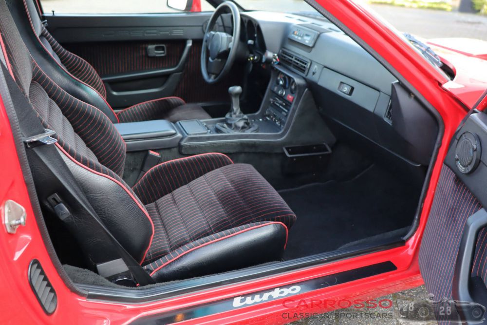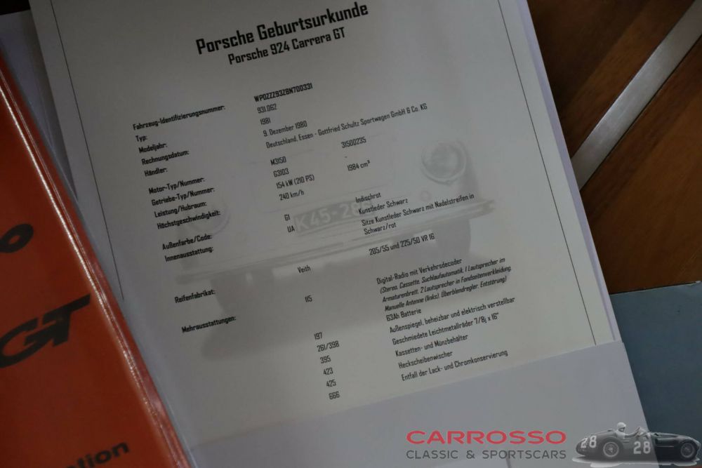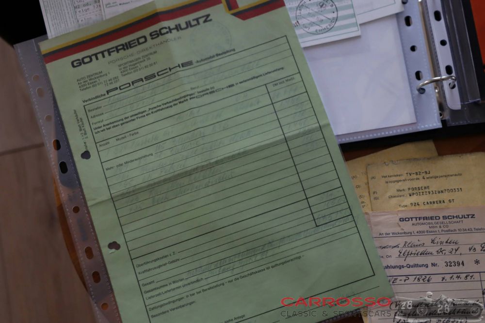 Although the Porsche 924 is known as a 'cheap' Porsche, the limited Carrera GT cost a whopping 108,800 guilders new in 1981. Only the 930 Turbo cost more. This example - no. 331 of only 406 built - was delivered on 2 April 1981 by 'Gottfried Schultz Sportwagen GmbH & Co' in Essen, Germany. The original purchase invoice is still present! The car was serviced at the same dealer until 1988 and was then imported to the Netherlands. The first Dutch owner sold the Porsche only in 2017 to its latest owner: a true Porsche enthusiast with a collection of special and rare Porsche's. With its bright red colour 'Indian Rot/Guards Red' (recently fully professionally polished), forged black Fuchs rims, Carrera GT decals and flared wheel arches, it is a striking and tough appearance. The Porsche stickers under the doors are original and very rare. Distinctive options include a digital radio, electrically adjustable door mirrors and a rear window wiper. A service was carried out in 2021 at a mileage of 129,577 km where the timing belt was replaced. The following original documentation is present with the car: a German sales brochure of the 924 Carrera GT from 1980, the delivery invoice, the service and maintenance booklet, the workshop manual and the Dutch import papers from 1988.