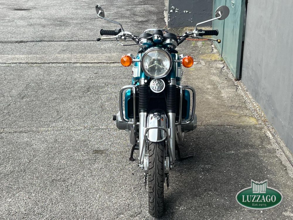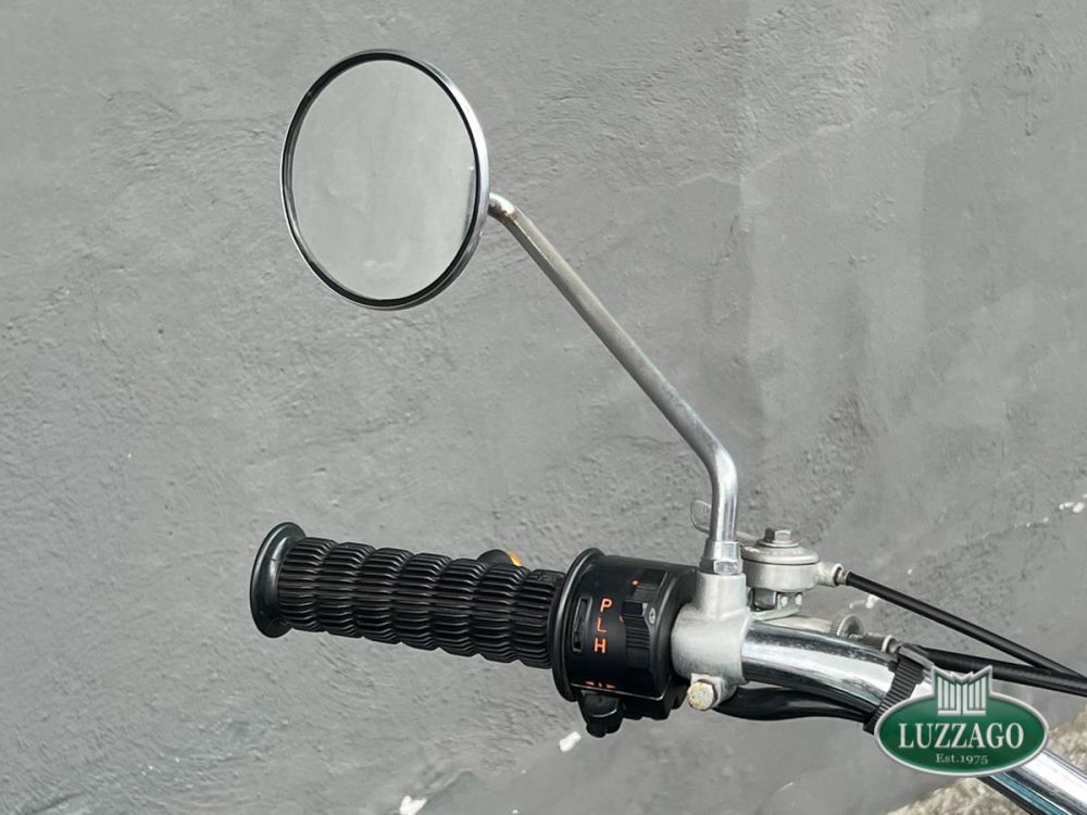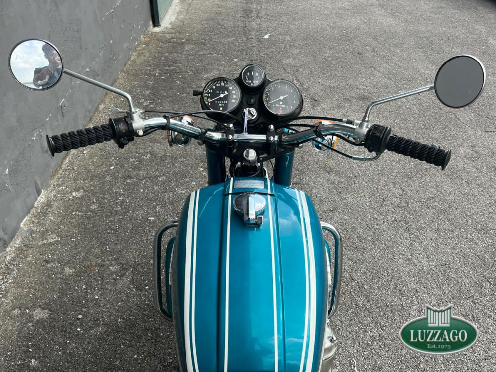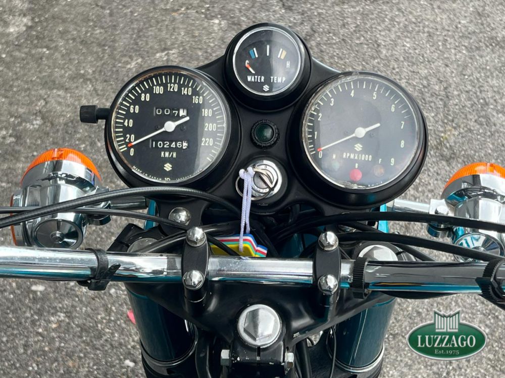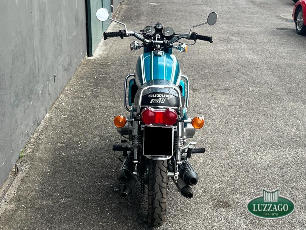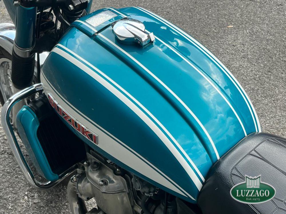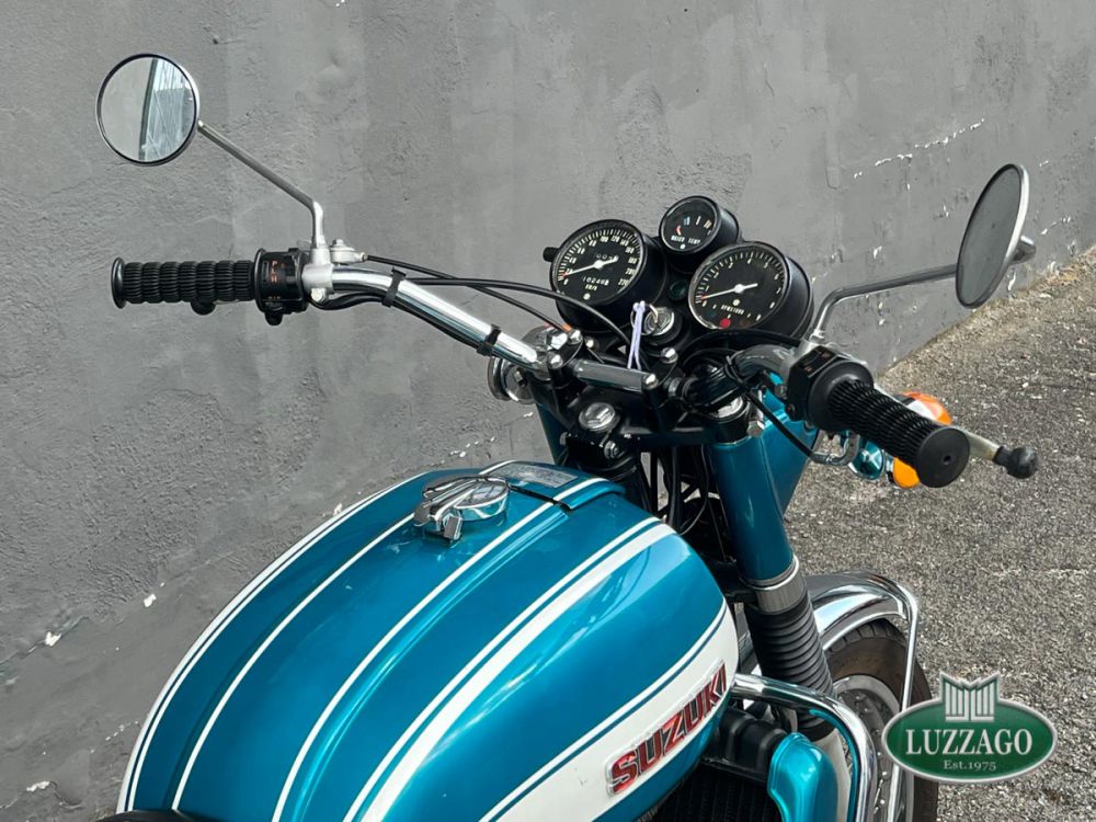 Esemplare stupendo ed ottimamente conservato in ogni dettaglio. La prima Suzuki costruita a raffreddamento ad acqua con motore 2 tempi. Azzurro metallizzato con pregiate rifiniture sportive bianche sul serbatoio. Percorsi poco più di 10.000 chilometri nell'arco di cinquant'anni.Anno di immatricolazione 1972, targhe di seconda immatricolazione Varese con libretto a pagine dell'epoca. Possiede attestato ASI. Solamente tre proprietari precedenti. Storia del modello e curiositàLa Suzuki GT 750 è una motocicletta di tipo stradale costruita dalla casa giapponese Suzuki, in produzione dal 1971 al 1977. Il contestoL'enorme successo di vendite della CB 750 Four che in un solo anno aveva conquistato i mercati statunitense ed europeo, surclassando la concorrenza dei prodotti inglesi e italiani di Norton, Triumph, BSA e Moto Guzzi, convinse e costrinse le altre case nipponiche ad accelerare i tempi di realizzazione delle loro future maximoto da contrapporre alla quadricilindrica della Honda. Nel 1969 la citata Honda CB 750 Four e la Kawasaki 500 H1 rappresentavano le due grandi novità che spopolavano sul mercato mondiale. Per la Suzuki si trattava di scegliere tra il propulsore a 2 tempi, di semplice ed economica costruzione e notevole potenza, ma penalizzato da fenomeni di surriscaldamento nell'uso prolungato e da alti consumi, e il propulsore a 4 tempi, resistente e parco nei consumi, ma complesso e costoso nella costruzione. La GT 750Nonostante il raffreddamento a liquido fosse l'innovazione maggiormente commentata, in quanto ben visibile, la finezza tecnica più significativa è rappresentata dall'originale sistema di lubrificazione separata, denominato CCI (Cylinder and Crankshaft Injection), che tramite una rete di diffusori alimentati in pressione da una pompa a portata variabile, lubrifica costantemente sia il gruppo pistone-cilindro-biella, sia i 4 cuscinetti di banco, riuscendo a ottimizzare la lubrificazione degli organi meccanici e, contemporaneamente, a diminuire in modo significativo la fumosità di scarico. Sempre con quest'ultimo scopo e per ottimizzare i consumi, la Suzuki aveva adottato l'originale sistema SRIS (Suzuki Recycle Injection System) che consente una migliore combustione dei residui giacenti nella parte inferiore delle camere di manovella. Nel complesso, la riduzione dei consumi apparve di modesta entità rispetto alla concorrenza duetempistica, ma la fumosità di scarico risultò molto simile a quella di un motore a 4 tempi.