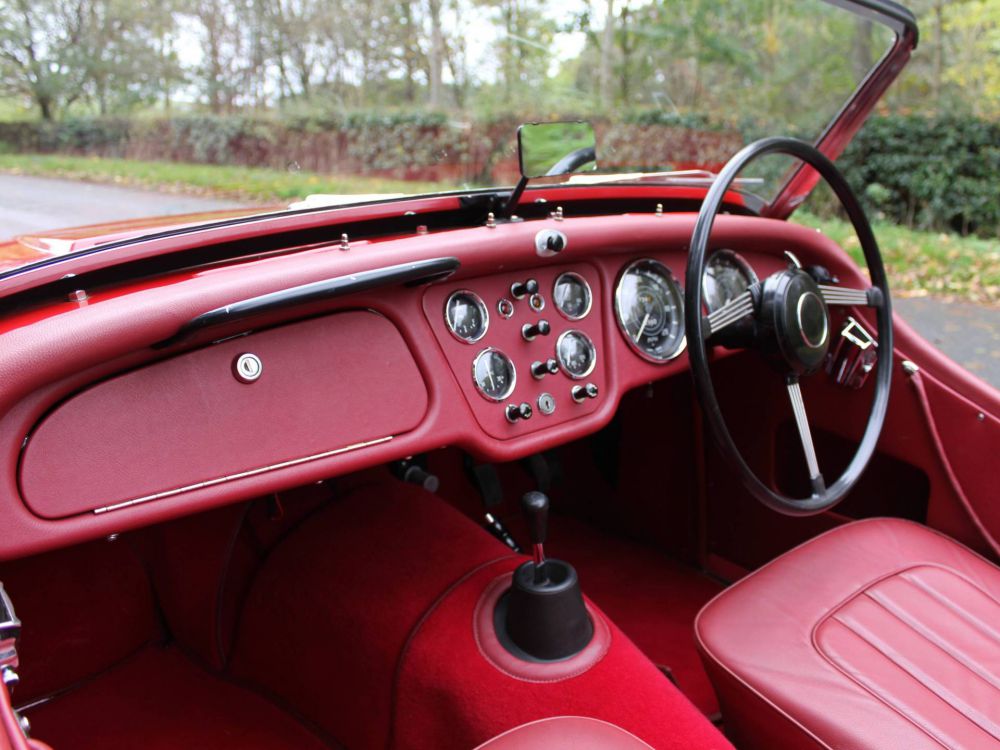 VAF 344 was registered new in Cornwall and an initial rebuild in the South West began well over thirty years ago. It was not completed or put back on the road and several years ago was purchased by the restorer. Everything on this car was either restored or replaced by new items. The car is totally original and it resembles the car as it left the factory and has a totally exceptional, immaculate underside. It has overdrive on 2nd, 3rd and 4th, has a heater and is re-trimmed in half leather. It retains positive earth and the colour is Signal Red with Matador Red interior with matching wool carpets. All chrome is either new or re-chromed and a new hood and new windscreen have been purchased. The engine has been stripped down and piston rings and main bearings replaced, a new oil pump has been fitted and the timing chain replaced. New parts include a fuel pump, water pump, dynamo, restored distributor, rebuilt carburettors, control box, fuse box, wiring loom, solenoid, master and slave cylinders, heater matrix, dash instruments, all lights and many more. There is a photographic record of the work and a comprehensive invoice file.
