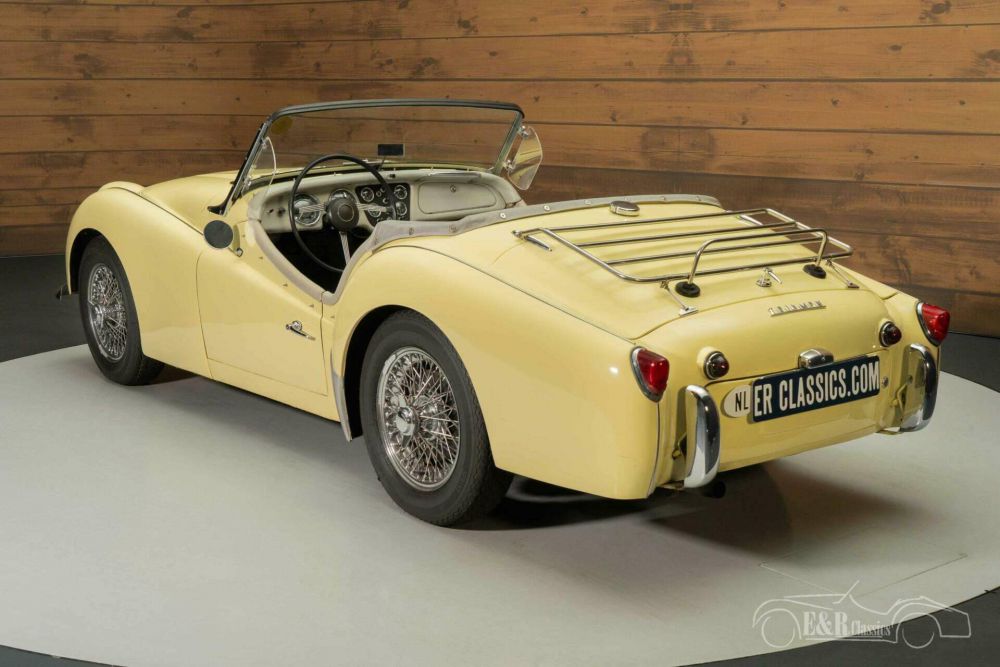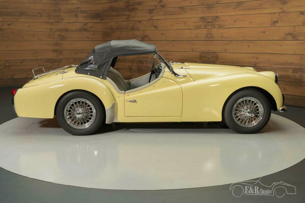 The Triumph TR3A that we offer for sale here is optically in good condition. It has yellow paint and various extras such as a chrome luggage rack, black soft top, grey tonneau cover and chrome wire wheels. The grey interior has some signs of wear here and there that completely match the character of this British Classic Car.