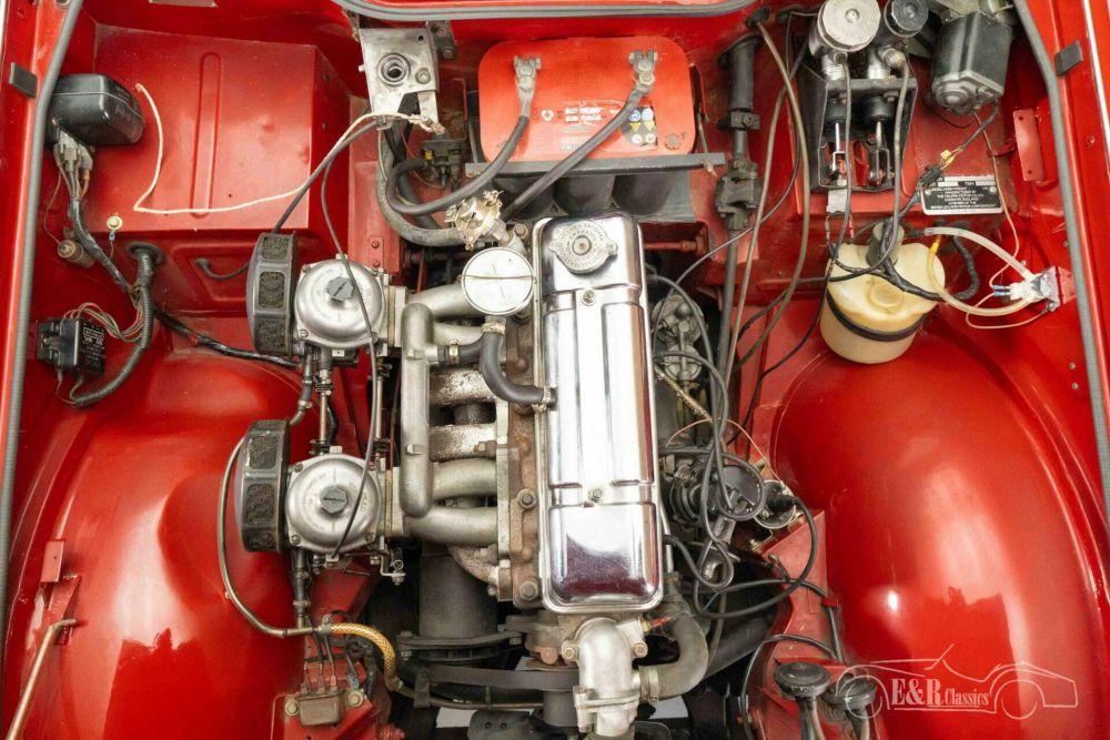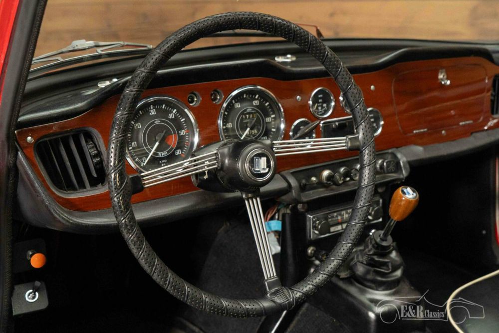 The TR4A IRS that we offer for sale here not only drives great, it also has a Surrey Top that you can complete with a black soft top. The TR4 IRS is equipped with chrome wire wheels and a luggage rack. The interior is in good condition and has a dashboard with wood veneer, leather-covered sports steering wheel and a wooden gear lever. The artificial leather upholstery has signs of wear. The red paint makes it a real eye-catcher.