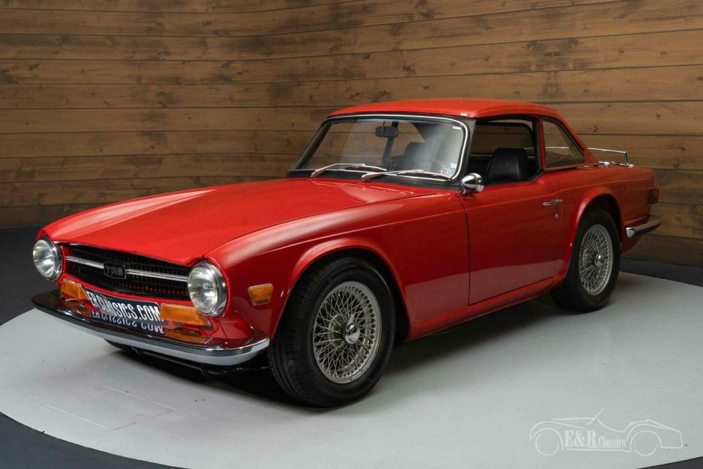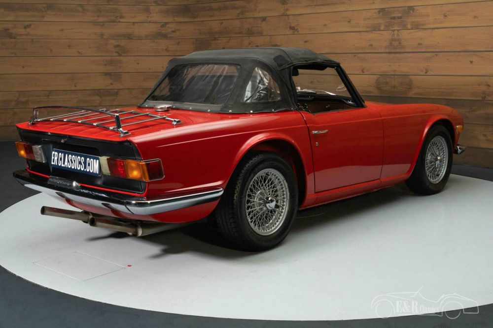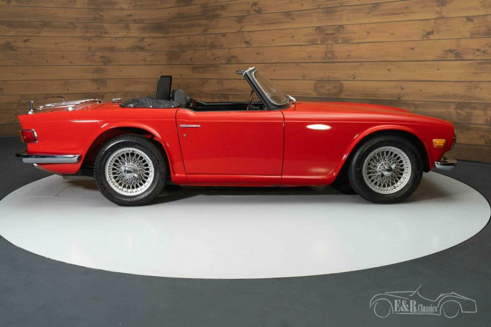 The Triumph TR6 that we offer for sale here is really great to see. It has a beautiful red paint that fits perfectly with this 1970s classic car and combines very well with the chrome. It stands on a set of painted wire wheels that contrast nicely with the paint. It is also equipped with a luggage rack and windshield that provides extra comfort while driving. The unique thing about this TR6 is that in addition to a black soft top, it also has a hard top in the same colour as the body. The black interior is in a neat condition and has comfortable seats upholstered in fabric and imitation leather. The wooden dashboard and steering wheel complete the classic look.