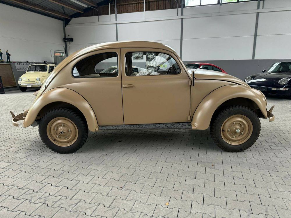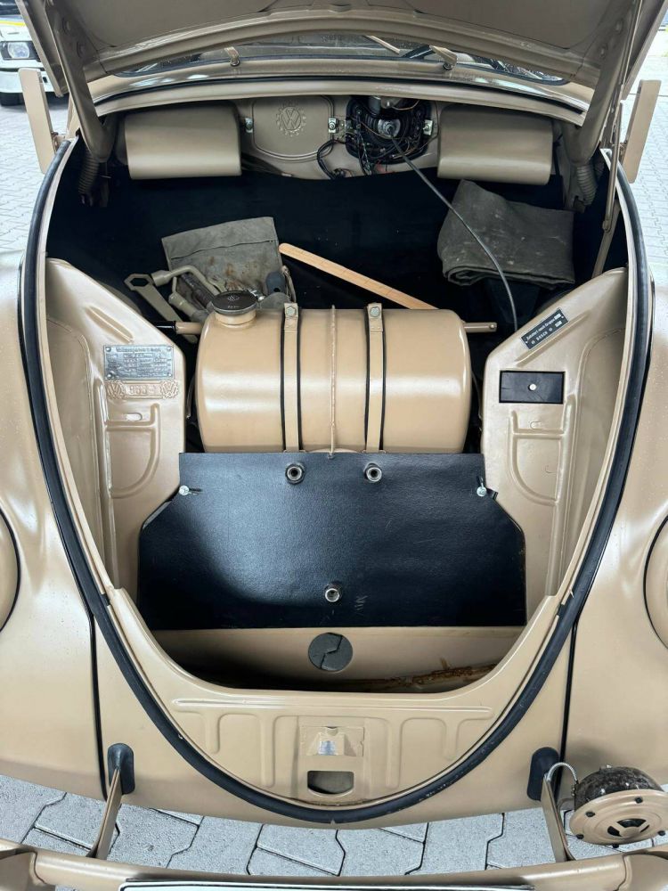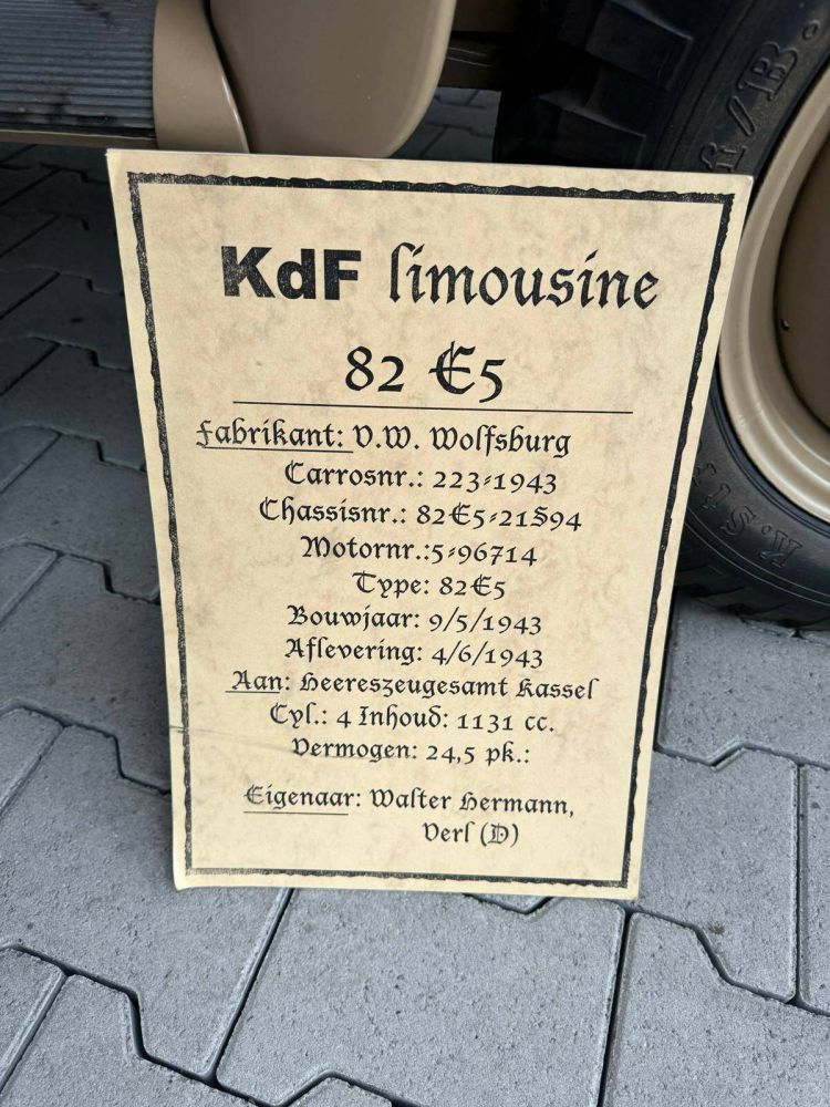 Der KDF Wagen war eines der wichtigsten Projekte der NS-Organisation. Mit einem Preis von 990 Reichsmark wollten die Nazis das Fahrzeug für jedermann erschwinglich machen. Bis Ende des Krieges wurden lediglich 1.206 Fahrzeuge produziert. Bei dem Käfer handelt es sich um einen KDF-Wagen des Typs 82e, welcher damals eine Spezialanfertigung der Wehrmacht war. Dieser Wagen wurde im Juni 1943 an das Heereszeugamt in Kassel ausgeliefert. Drei Jahre später wurde das Fahrzeug an einen Privatmann in der Tschechoslowakei verkauft wurde, bevor ihn Hermann Walter 1987 wieder zurück nach Deutschland holte und hier komplett restaurierte. Seit der Restauration befindet sich der KDF-Wagen in der Hermann-Walter Sammlung in Kaunitz. Komplette Historie nachvollziehbar.
