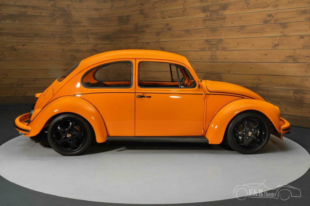 The appearance of this VW Beetle also fits perfectly with its sporty performance. The Porsche GT3 RS orange was chosen, a great combination with the black Porsche rims. The dark interior and floor mats with orange piping make it beautifully complete.