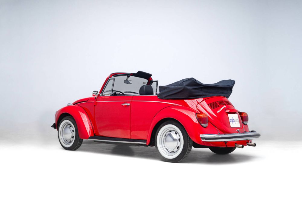Volkswagen 1303 S Cabrio of 1973. This version is the last version of the classic beetle in cabrio, being the one with the biggest engine and mechanical and chassis improvements, the 1303 S Cabrio is fitted with the 1,600 cc engine. The S for sport, based on the existence of a 50 hp engine and the installation of disc brakes on the front axle. Once inside, we notice some comfort details, such as the presence of seats with built-in headrests, a dashboard painted in black and a special Karmann steering wheel, responsible for manufacturing the open versions which, by the way, are very well resolved, with a soft top that folds and unfolds easily and, when driving with it on, insulates the interior very well from the inclement weather, with the added bonus of not making much noise. The instrumentation is limited to a central speedometer, which incorporates a fuel level indicator (there is no longer a stopcock for using the reserve) and a total odometer. It seems that Volkswagen is putting across the idea that a car as reliable as the Beetle doesn't need any more information. However, in order not to take too many risks, a couple of warning lights are placed inside the speedometer to make sure that the dynamo is charging correctly and that the oil pressure at idle is at the correct values. The VW Beetle was one of those phenomena in the history of the automobile whose life was a freak of logic. In 1972, the 1303 series, whose main change was the replacement of the front axle with overlapping arms and torsion bars by a much more modern, lighter, smoother and more progressive McPherson strut. At the rear, modifications were also made to a transverse arm layout, although in the latter case the torsion bars were retained as spring elements. It is curious that, with this type of suspension, the Beetle ended up with solutions similar to those of its first cousin, the Porsche 911. On the mechanical side, the air-cooled boxer four-cylinder engine was further developed and the displacement was increased to 1,600 cc by using larger pistons. With this work, Volkswagen announced the extraordinary performance of 50 hp. A figure that may make us laugh, but which was ultimately responsible for the extraordinary durability of these engines. If we add to this the fact that the German brand used extremely long gear ratios, with which the engine rarely exceeded 4,000 rpm (maximum power) in the highest gear, it is perfectly understandable that the top speed was also advertised as a cruising speed. Starting the engine requires no more work than fully depressing the accelerator and releasing it to engage the automatic choke and turning the ignition key. Normally, the 1600 starts up at the ?quarter turn, ready for us to start the engine. The gear lever is easy to operate, as long as you don't use it too quickly, as the gear lever's travel requires you to follow it correctly. From the first few metres we notice the presence of an engine with higher torque values than the 1,200 and 1,300cc engines, although the sensations it transmits are very similar: quiet revs accompanied by the unmistakable purr of the opposed four-cylinder.This ad is not binding, may contain errors, is shown for information purposes only and not contractual.