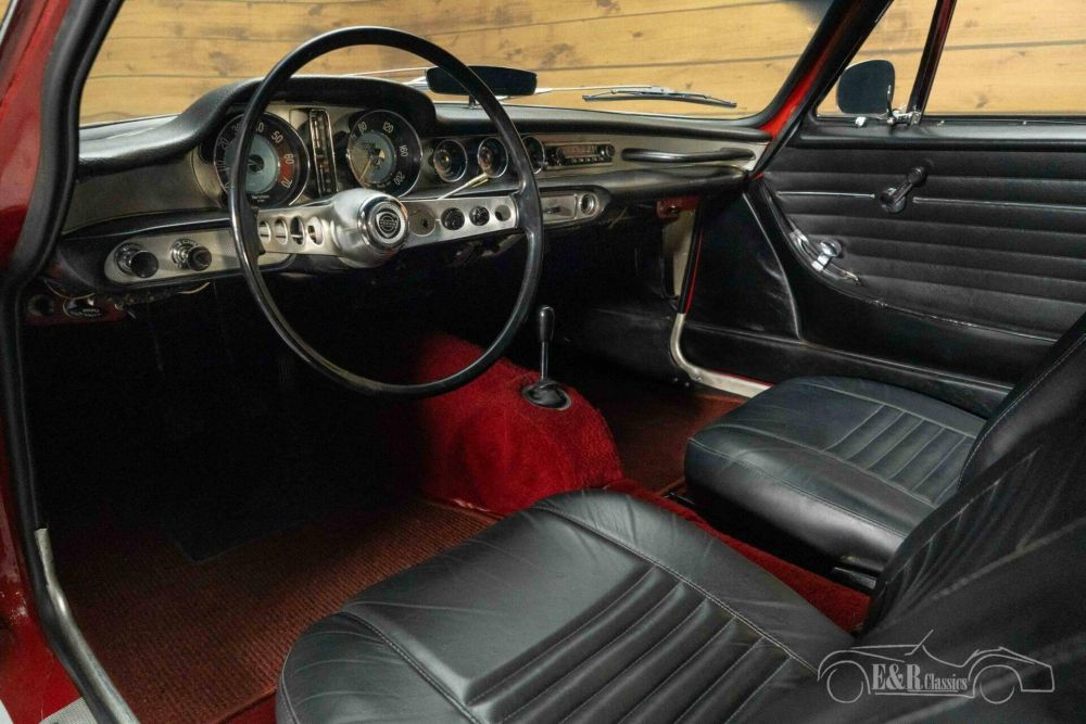 The exterior of this Volvo P1800 is finished in its original colour Red, which fits perfectly with the classic lines and chrome accents of the car. The characteristic grille and elegant bumpers emphasize the sporty yet elegant appearance. The red steel rims with chrome hubcaps complete the whole. The interior exudes pure classic atmosphere with the black leather interior, a beautiful Jensen rear seat and the original dashboard with aluminum finish and classic meters. The combination of the deep red paintwork and the chic black interior gives this Volvo a timeless look that makes it an absolute rarity in the world of classic cars.