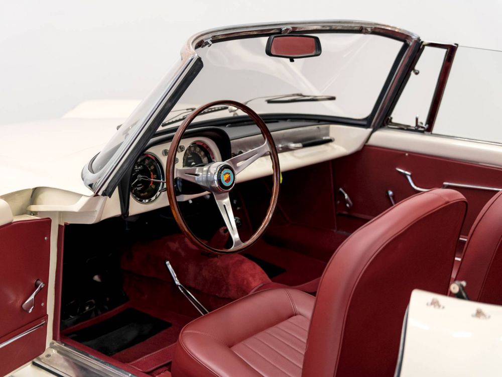Proposta in bianco pallido con interni rosso sangue e con la capote retrattile, la Spyder Allemano è uno squisito oggetto da collezione.
