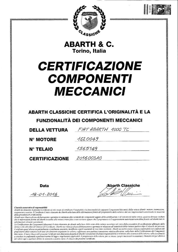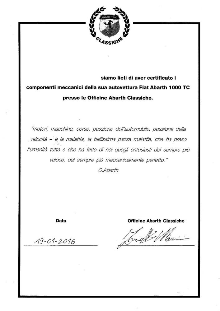DISPONIBILE CERTIFICAZIONE COMPONENTI MECCANICI RILASCIATA DA ABARTH CLASSICHE CHE CERTIFICA L’ORIGINALITA’ E LA FUNZIONALITA’ DEI COMPONENTI MECCANICI RISULTATI CONFORMI ALL’ORIGINALE