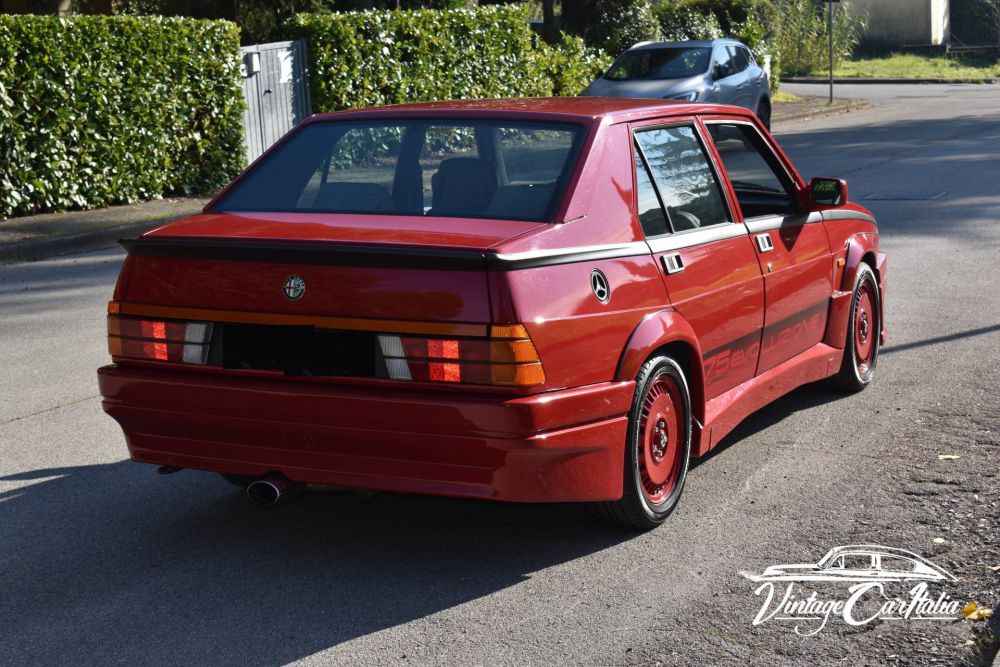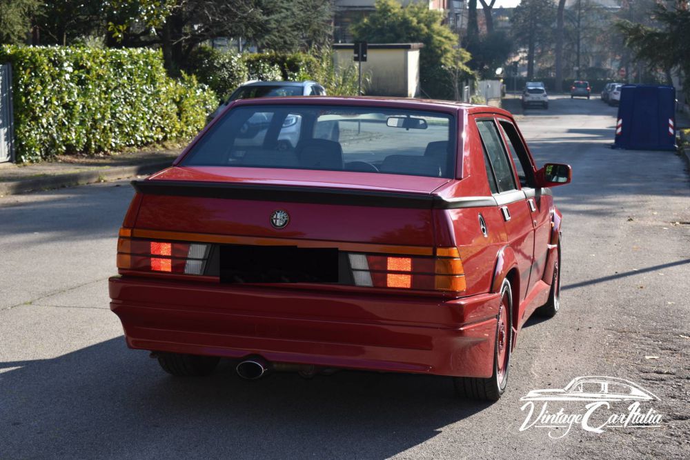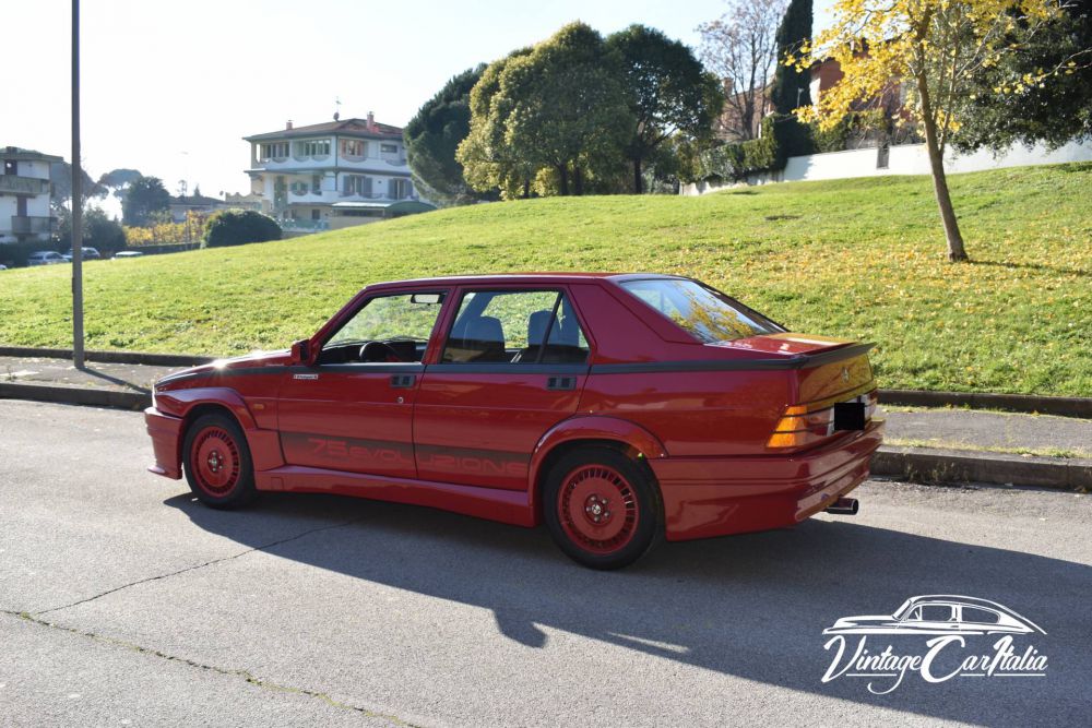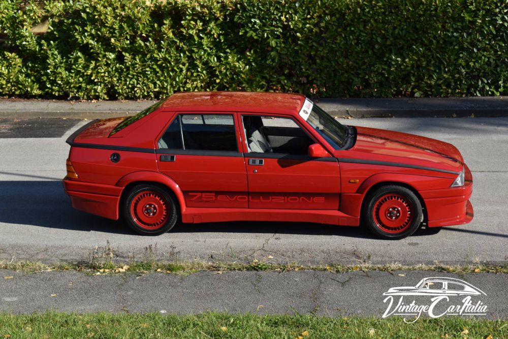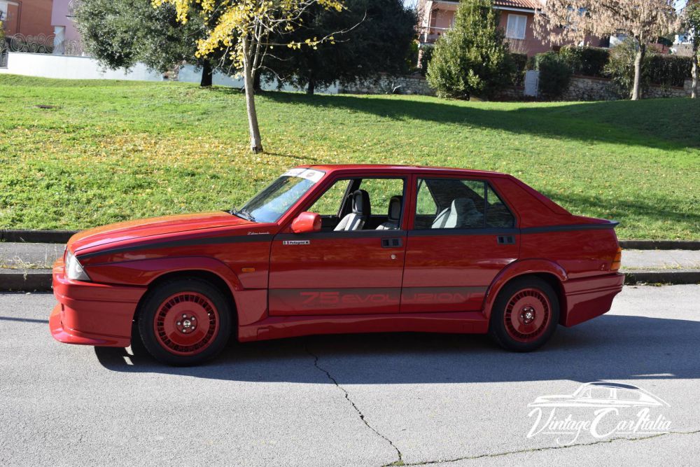 Alfa Romeo 75 Turbo Evoluzione  Serie limitata della 75 costruita in 500 esemplari, numerata 118/500. Numero necessario per iscriversi al Gr.2 e accedere al campionato Gran Turismo nell’anno 1987. Conservata sempre al coperto e utilizzata regolarmente per mantenerne la piena efficienza, si presenta in condizioni di eccellenti. Carrozzeria e fondi sani e in perfette condizioni, la vernice Rosso Alfa originale è stata recentemente rinfrescata . Matching Numbers ovvero motore, trasmissione e telaio mai sostituiti. Motore impeccabile con manutenzioni regolari. Verifiche ad assetto e impianto frenante ed elettrico periodiche. Stacca batteria. Pronta a partire.Gli interni in stoffa color grigio originali pari al nuovo, non presentano tracce di usura. Cruscotto e plancia perfetti come le guarnizioni di porte, finestrini e parabrezza.  Volante originale,  terminale di scarico e filtro aria completo disponibili come da foto.  Iscritta al Registro ASI con Certificato di Rilevanza Storica.
