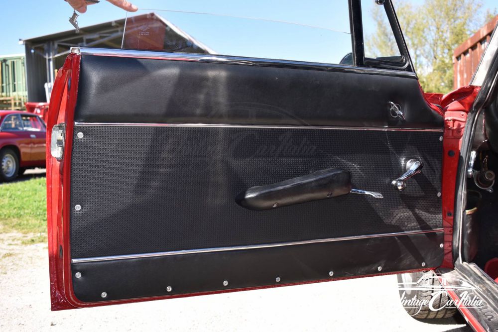 Gli interni sono stati riportati all’antico splendore, sedili in pelle scai di color nero e moquette in abbinamento nero/rosso. Cruscotto piatto e strumenti di indicazione in perfetto stato di conservazione.