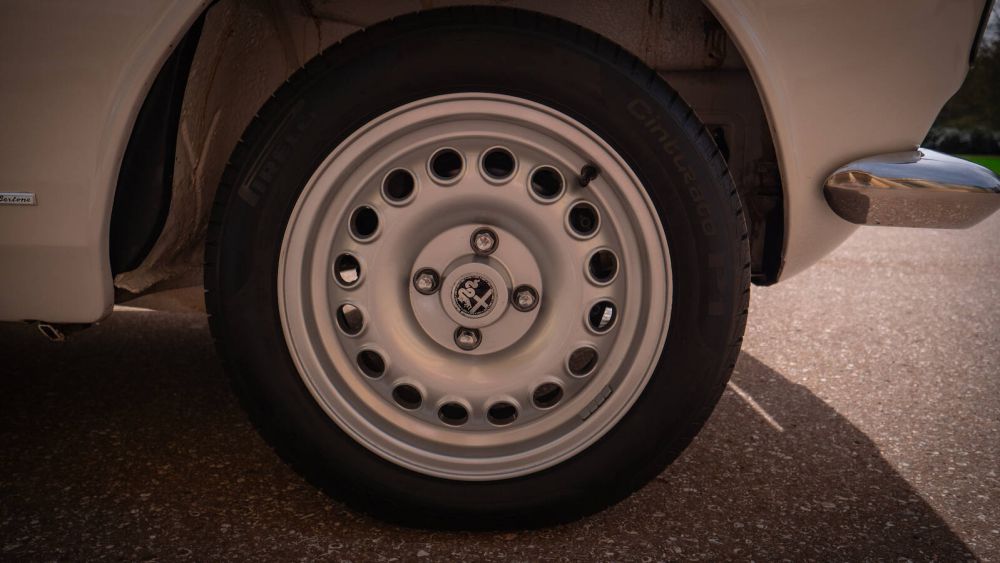 Underneath the car you will find the original 15″ Alfa Romeo rims with matching hubcaps and good tires. The stainless steel bumpers and moldings around the car are very neat and complete the appearance. The interior is timeless with the beautiful dashboard and steering wheel, the headliner and the black carpets.
