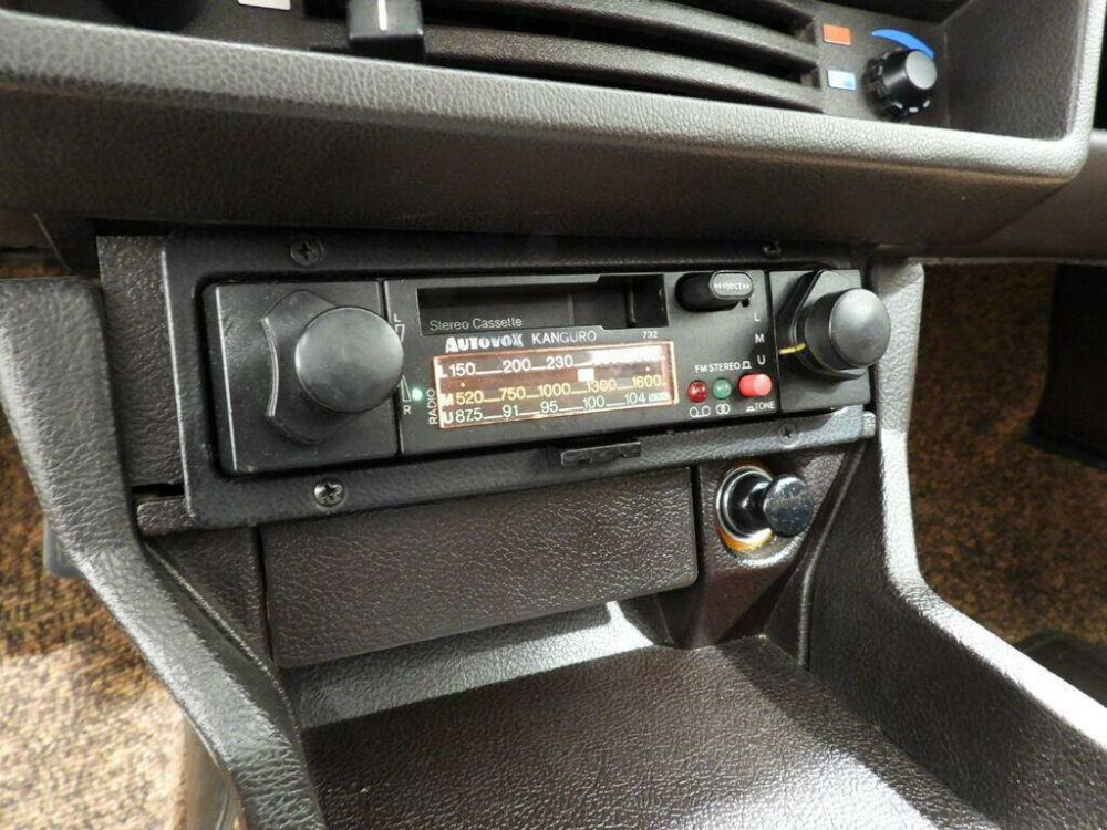 Seats and panels in brown cloth with dark brown inserts, front seat belts, dark brown dashboard, brown loop carpet on the floor, Autovox Kanguro AM/FM stereo 7 cassette car radio, Vitaloni rectangular black driver's side exterior mirror, Analogue clock, 5 iron rims with Alfa Romeo caps with 165/80 R13 tires