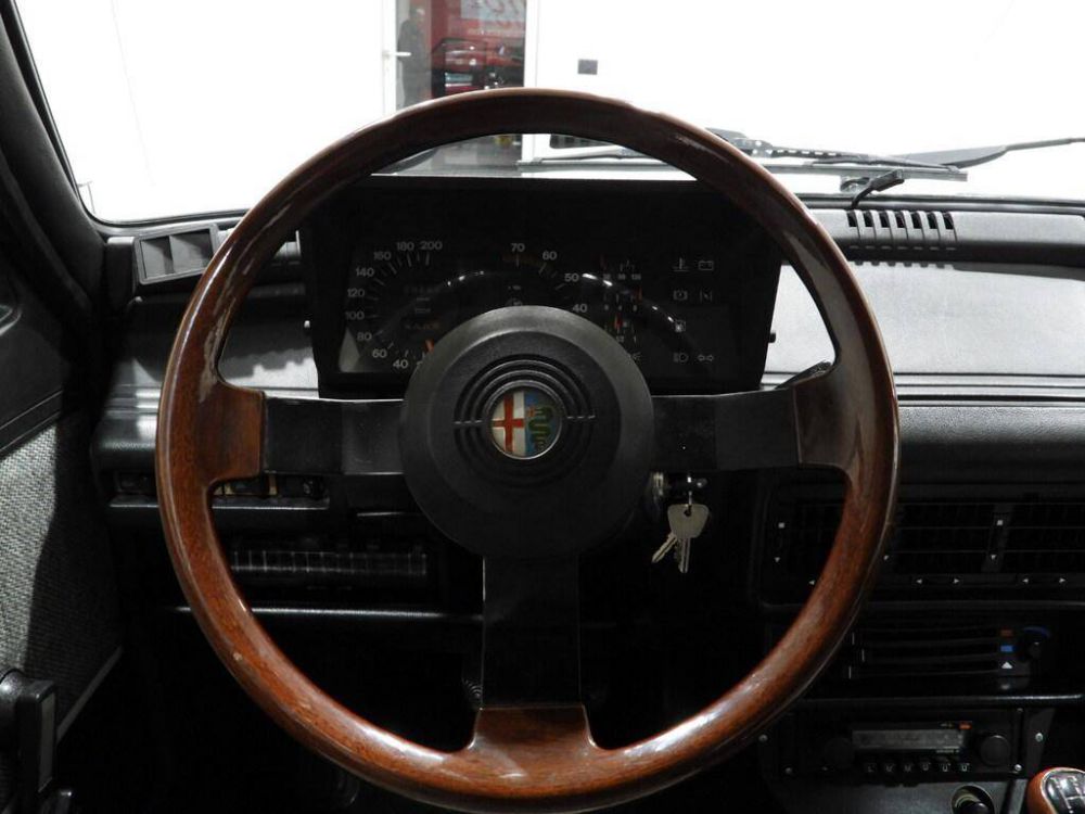 Sedili e pannelli in tessuto grigio e Tex Alfa Sky Nero, Cinture di sicurezza anteriori e posteriori, Volante e pomello del cambio in simil legno, Autoradio Blaupunkt Nurnberg AM/FM con antenna al parabrezza, Frecce laterali anteriori trasparenti, Fari fendinebbia rettangolari a luce gialla, Cerchi in ferro con calottina Alfa Romeo cromata con pneumatici 185/70 R13, Specchio esterno lato guida Alfa Romeo regolabile elettricamente, Retronebbia posteriore