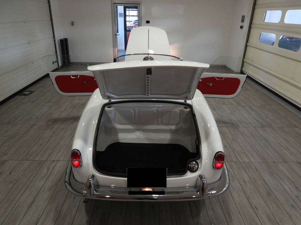 Sedili e pannelli in sky rosso, Moquette in lana rossa al pavimento, Sovratappeti Millerighe in gomma originali dell’epoca, Specchio retrovisore esterno lato guida cromato, Capotte in tela nera