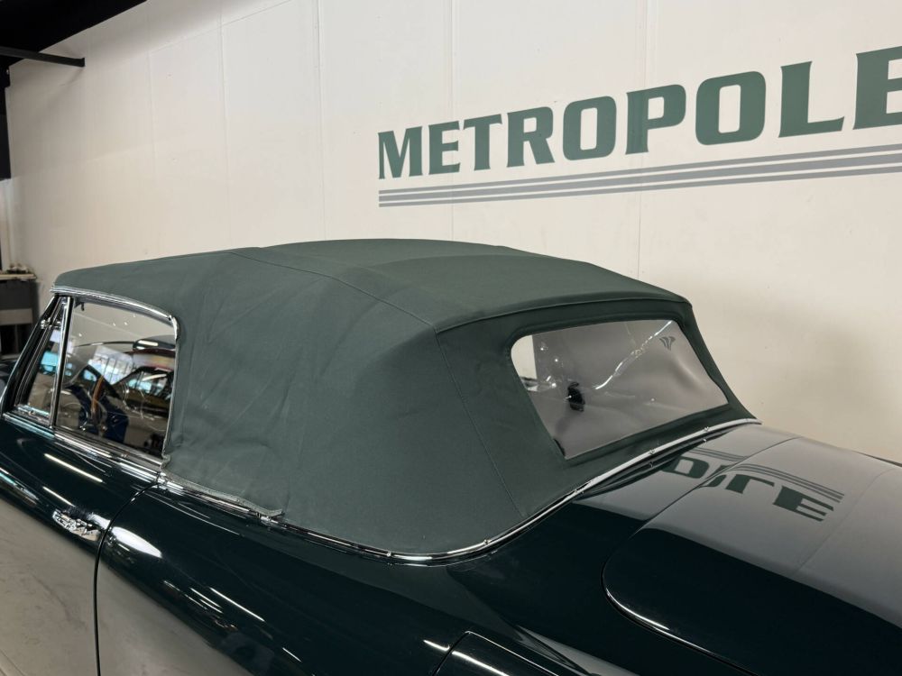 Today, the car is presented in a striking green exterior, complemented by a matching green soft-top roof and protective tonneau cover. The interior features green leather upholstery, green carpets, and door panels, contrasted by a black dashboard and a wood-rimmed steering wheel. The vehicle comes with its original tool kit, a copy of its Aston Martin build sheet, registration documents and a FIVA identification card.