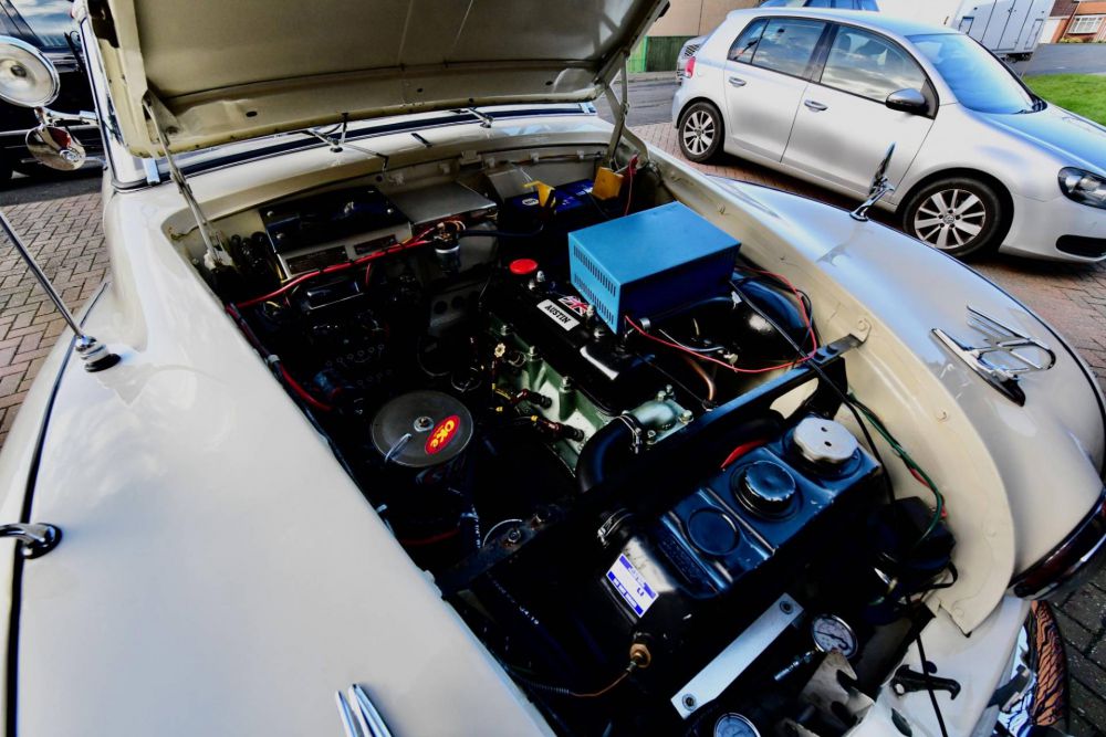 1949 Austin Atlantic Convertible Registration Number: PXS388 Chassis Number: BD2-L/38234 This is one of a pair, this car being in Cream with the other in Ming Blue. Purchased in Australia in totally rot & corrosion free condition. This car then nevertheless had a body off exhaustive restoration to like new. With the government edict of export or die, and steel allocated only to those who generated much needed revenue, the Atlantic was designed specifically to appeal to North American tastes. The car featured up-to-the-minute detailing, with a wrap around windscreen, composed of a flat glass centre section with tiny curved end panels. The front wings (fenders) sported twin flying A hood ornaments and swept down to a rounded tail, with spats enclosing the rear wheels. A centrally mounted third, main beam, headlight was built into the letter-box style air intake grille, and the then unheard of luxury of hydraulically powered windows and hood (convertible top), flashing indicators (blinkers) rather than trafficators, (for the United States market at least) and the option of EKCO or HMV Autocrat radios. This Austin A90 Atlantic Convertible is an arresting sight today: think what an impression it had sixty years ago when it appeared on America's highways and boulevards. With its curved hood, three headlights, chrome hood stripe, curved and raked windshield, sweeping envelope fenders, skirted rear wheels and sleek blind quarter convertible top it was way ahead of its time in 1950 and still looks like an auto show concept car that has somehow found its way onto the street. Its colors, a bright greenish-blue hue of tropical waters set against dark blue leather with white piping and a dark blue convertible top are emblematic of the early postwar years' enthusiasm and optimism. Sir Herbert Austin's company envisioned it specifically to appeal to the American market, giving it dual outside mirrors, whitewall tires with hubcaps and chrome trim rings, gold gauge faces, seating for five with a 60-40 split front bench seat and, for some reason known only to British designers, two glove boxes in the dashboard. Its 88hp 2660cc overhead valve four later proved its mettle as the power plant for the first Austin-Healey 100/4s. With the body off the chassis was bead blasted & refinished to as new. Likewise the Body panels were shot blasted & all corrosion attended to. The restoration list is far too long to go into here but suffice to say included everything except the differential internals as it was found to be in perfect order as it was. The painstaking re-assembly job was then undertaken to bring the car up to the wonderful standard we find it in today. In addition to the full rebuild, the hydraulics were upgraded for the roof & door windows with twin gauges under the bonnet displying the hydraulic pressure. The engine is fully rebuilt as is the gear box, the brakes, a complete rewire & pretty much anything else one might imagine. Both cars we have for sale are close to perfect. Far more was spent upon this project then the owner will ever see back & he needs now to sell the pair of then due to the onset of old age. The car comes with a massive bill & history file showing the work that has gone into it & also a Heritage certificate showing it to be matching numbers. Body off full extensive nut and bolt rebuild,