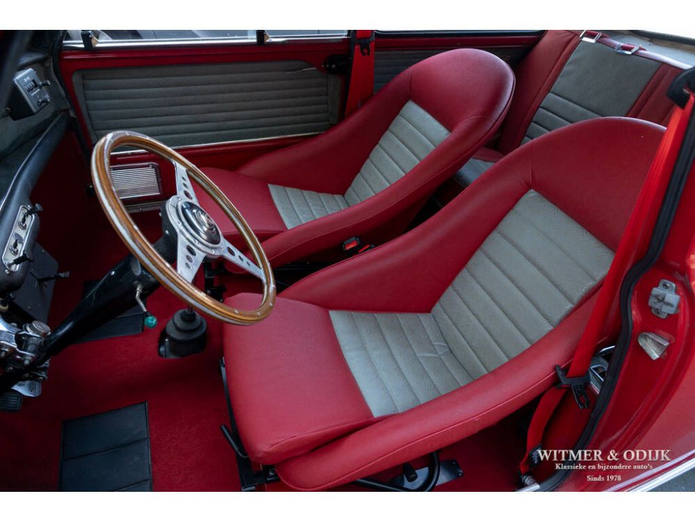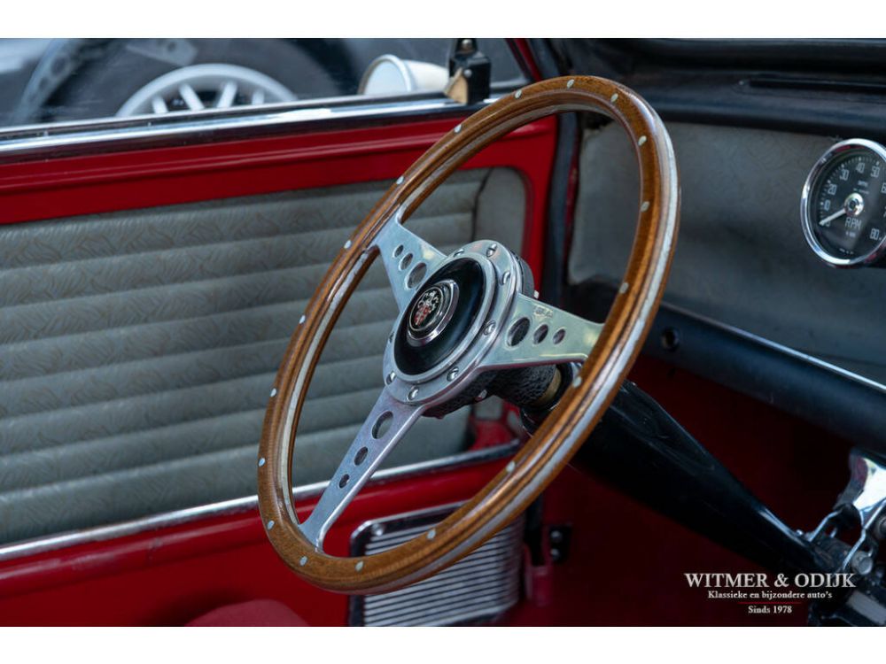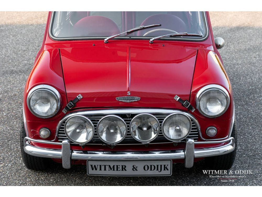 Een van de eerste 200 1275 Cooper S exemplaren. Rubber vering. Heritage papieren. Prod. datum: 12.5.1964, geleverd in Zweden. Matching numbers. Speciale bucket seats, alles in originele kleurstelling. (Newton Commercial) Bekleding origineel. Smith toerenteller 10.000 rpm Halda afklapteller (werkt nu niet) Houten stuur Moto Lita met originele Austin claxon unit. Stuurversteller. Walpres alloy buitenspiegel (period, zeer zeldzaam) Bekleed plankje in kofferbak. Swiftune kop, nieuw, bewerkt. Oude originele kop is erbij. Swiftune blok uitgevoerd met speciale bussen/S-krukas, drijfstangen en zuigers. Fast rally nokkenas (van de beste UK producent) Gesmede S tuimelaars. Twee HS4 SU’s. Elektronische ontsteking. Competitie high output oliepomp. Speciaal dubbel uitlaatspruitstuk 3 in 2 naar 1 (Swiftune) met volledig nieuw uitlaatsysteem. Nieuwe radiator met 50% meer koel capaciteit, 2-core, (Mini Spares) Siliconenrubber waterslangen. Nieuw licht vliegwiel met nieuwe drukgroep en plaat Volledige bak revisie S-bak, origineel, o.a. nieuwe primaire as (Frans Verbaas). Remmen rondom gerestaureerd, evenals gehele ophanging, door Frans Verbaas Preparations, Oud Beijerland. Nieuwe rembooster. Carrosserie niet gerestaureerd, grotendeels eerste lak. Twin tanks (rechter tank is vervangen, was ooit beschadigd) Alles hierboven heeft minder dan 50 km gedraaid. 5 x Avon 165/70R10 CR6 (allerbeste band, circuit en voor de weg) 5 wielen Rose Petal alloys. 5 brede originele stalen Cooper S velgen, wit gecoat, nieuwstaat. Set van 4 Lucas stralers, op bar, originele Cooper rally set, excellent conditie (nu afgekoppeld) Rally auto, uitgerust met BMC originele stuurslot. Heel lang in één rally familie geweest. Extreem origineel t/m kofferslot, plafondlampje, zonnekleppen en binnenspiegel…. Glas grotendeels 1964 gecodeerd.