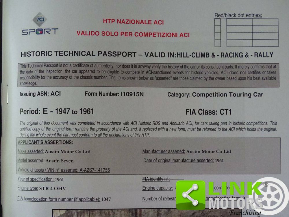 PROPOSTA DI VENDITA: Splendida auto d'epoca Austin Seven del 1961 preparata Pronto Corsa con certificazioni ufficiali ed in corso di validita FIA e HTP con sedile, cinture ed estintore aggiornati e a norma, vetri in lexan. Adatta a competizioni di velocita e salita - Preparata ma non ha mai partecipato a nessuna competizione. Possibilita di reimmatricolarla in Italia partendo dal libretto di circolazione originale inglese. SOLO VERAMENTE INTERESSATI