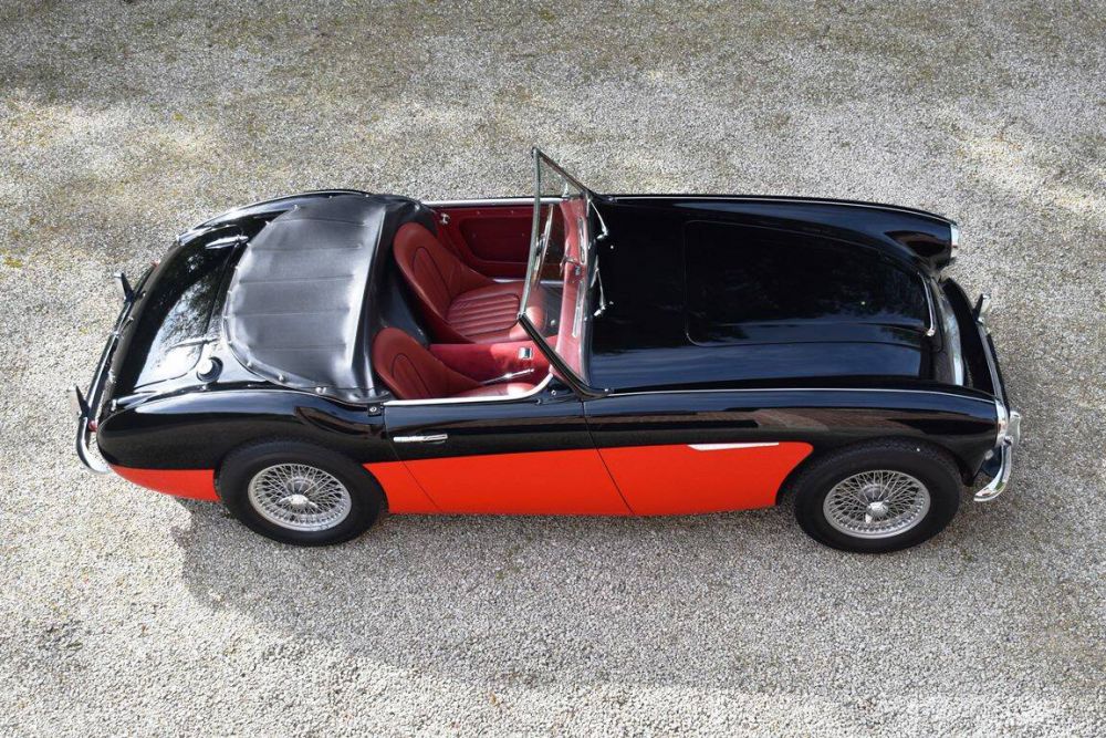 This Mk1 is a 2+2 version, officially called the BT7. These two little seats in the back are ideal for children, to store some luggage or even taking your dog(s) with you. This example is professionally restored 15 years ago, and kept in immaculate condition since. The paint quality is from a very high level, and the shutlines on this Austin-Healey are perfect which is rather unusual on this type of car. On top of that, it is a rare European specification car which was delivered new in Germany on the 23th of July 1960 and comes with a BMIHT Heritage Certificate to prove. The car is equiped from new with most of the available options : heater, electrical overdrive, wire wheels and laminated windscreen. It is finished in a gorgeous colour combination of Black over Colorado Red. The interior is in matching red hide which suits this Austin-Healey extremely well. The car sits on painted wire wheels fitted with recent Vredestein Classic tyres. There is a lot of documentation in the file including many restoration and service invoices. The Austin-Healey has a Belgian registration.