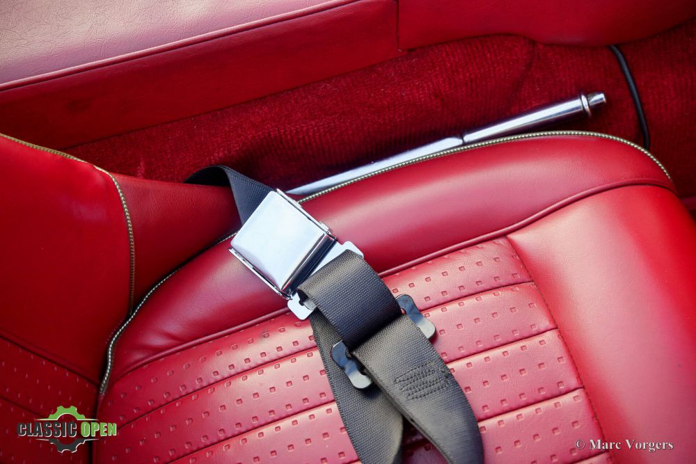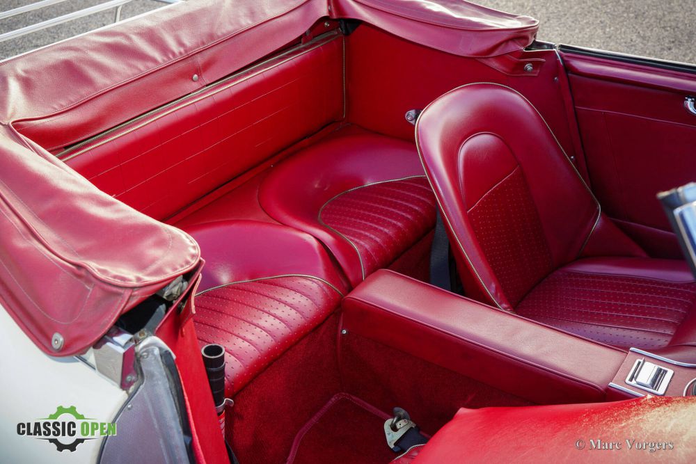 Colour Old English White combined with a red leatherette interior trimmed with red carpet and black rubber protective mats. Red vinyl soft-top, hood-cover and tonneau cover.