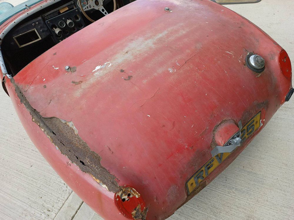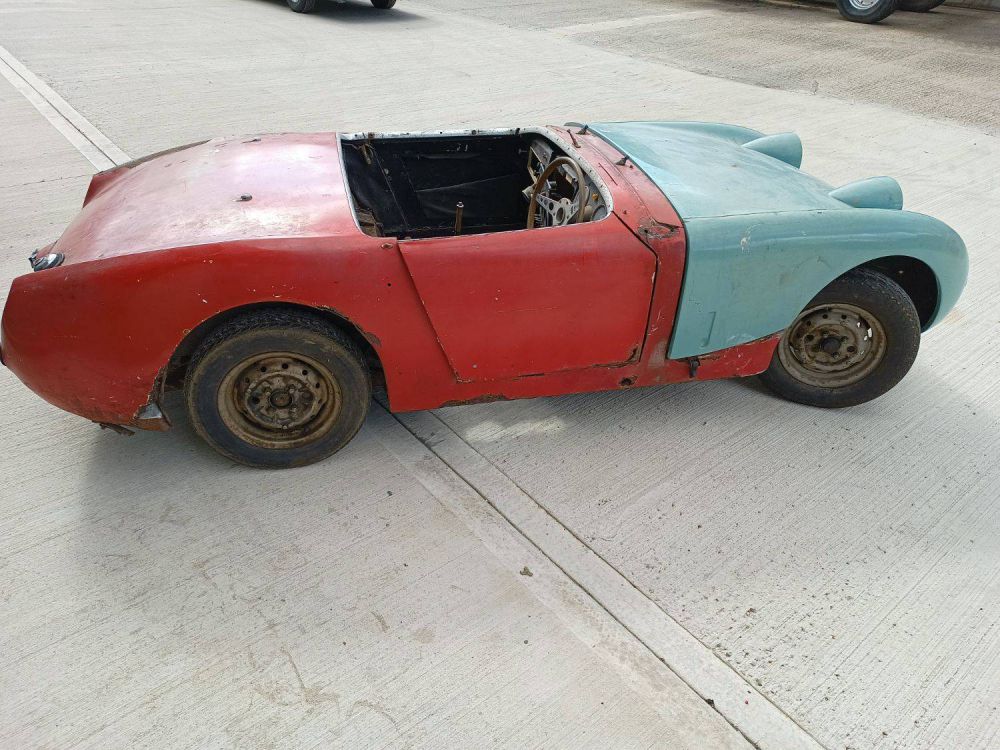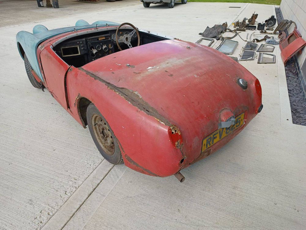 This original 1959 Frogeye with only 3 former keepers has been parked in a dry garage for 36 years. It's in need of full restoration but what a smashing thing it will be when done. The chassis appears generally sound and solid but floors, sills, wheel arches etc. will all need significant work and/or replacement with new panels. The original steel bonnet seems to have been removed in 1983 but it comes with a good quality fibre-glass replacement. It is a largely complete car save for one or two bits - e.g. there are no seats and no hub cap covers - but comes with good quality original replacement doors and various window / screen attachments. Hood frame and chrome cappings are present - please study the pictures for what's there! The gearbox is full of oil and turns freely but the engine has been dismantled and will require a full rebuild. All original major components appear to be present. With parts and panels readily availble for these cars why not take the plunge and get this previously unrestored Frogeye back up to scratch and back on the road. Comes with V5C log-book, keys and just a few old tax and MOT records.