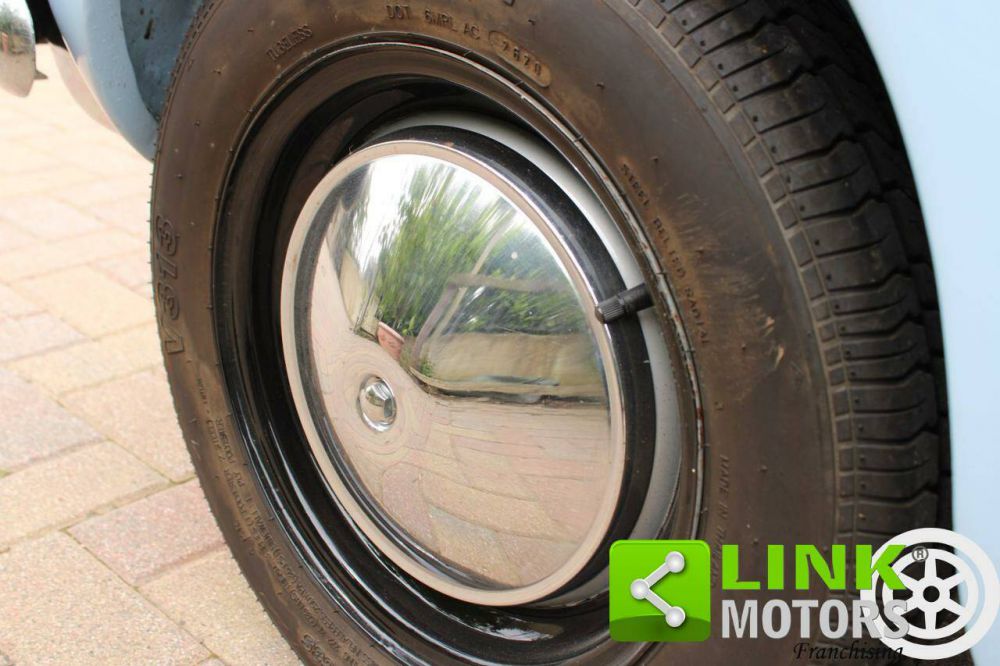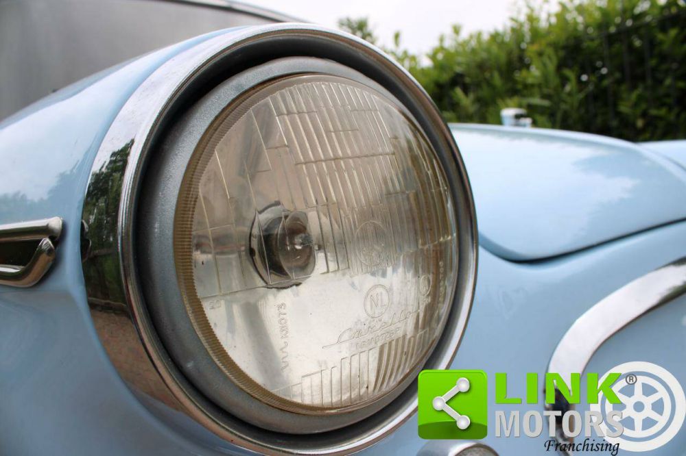 DOTAZIONI: Vettura interamente restaurata. Cerchi bicolore originali a pera con coppiglie originali. Ha i fanalini anteriori (giustamente tondi anziche ad unghia), spostati verso il centro, mentre al posto dei vecchi fanalini ad unghia sono state sistemate come in origine due finte griglie cromate di produzione odierna. Ha filtro aria piccolo tenuto da tre bulloni e pulsante clacson con un anello dorato. Paraurti e copritarga con luci nuovi. Selleria nuova.